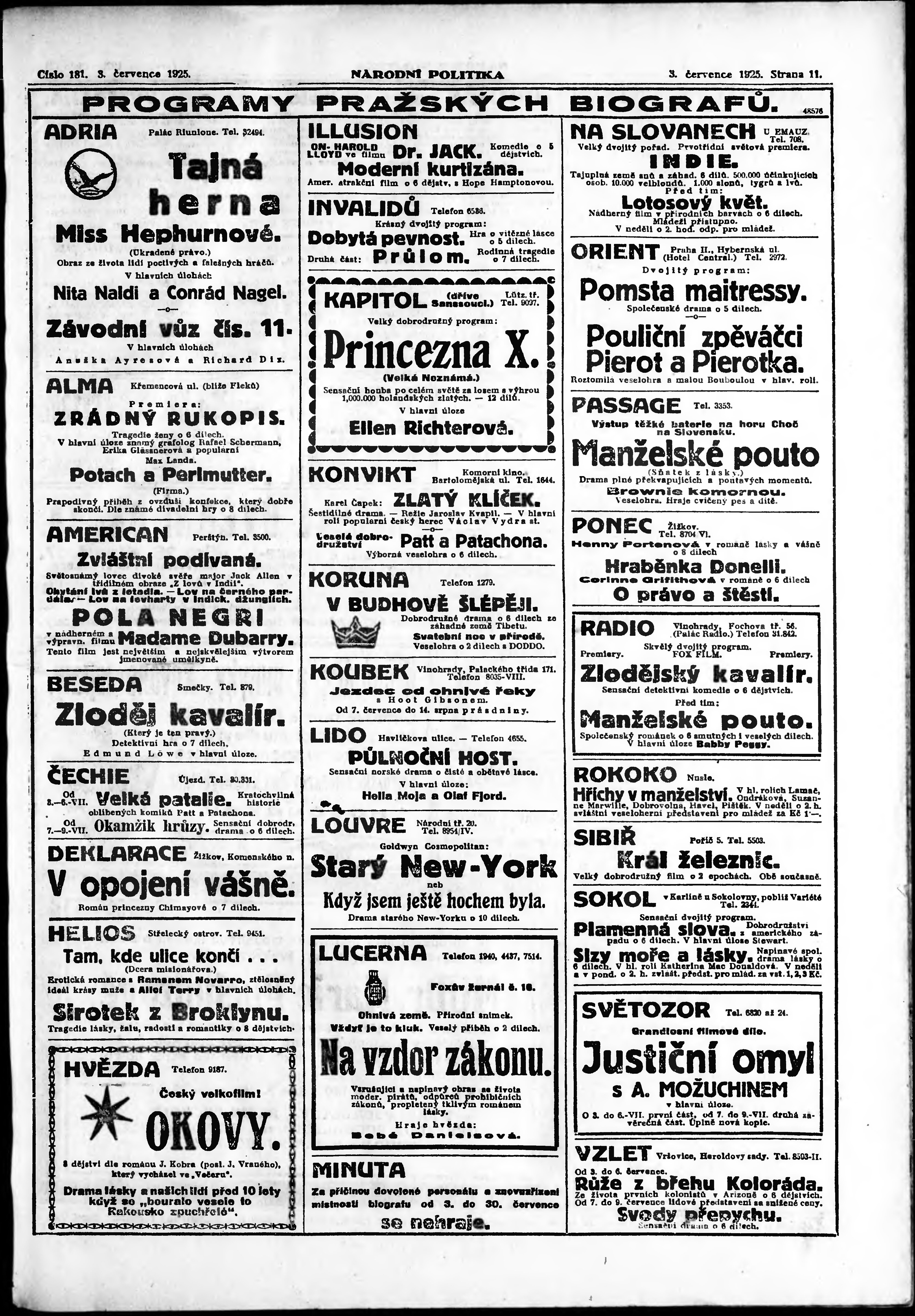 * Datum vydání výtisku: 3.7.1925 Číslo výtisku: 181 Poznámky k výtisku: ranní vydání; vydání pro Prahu;