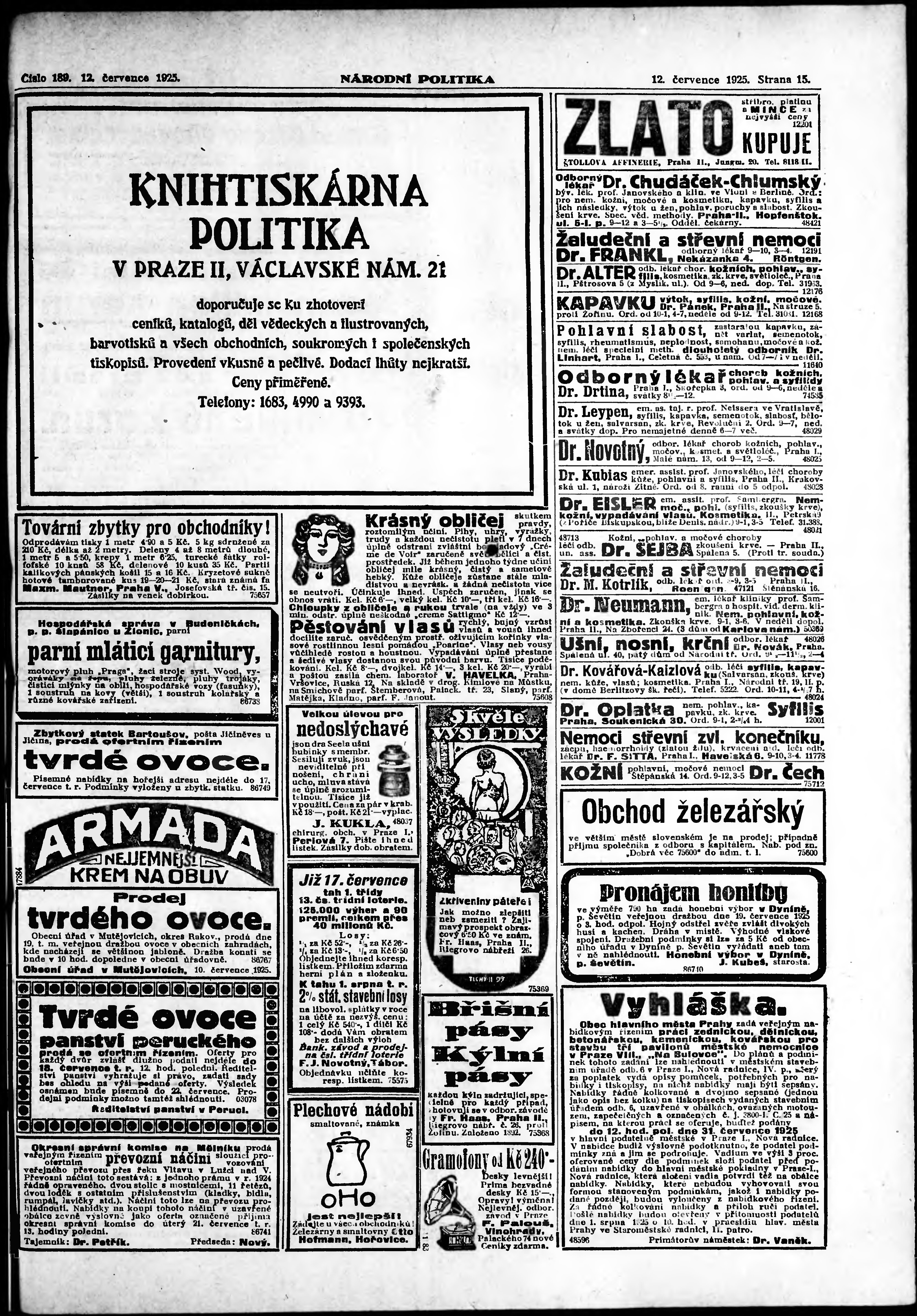 * Datum vydání výtisku: 12.7.1925 Číslo výtisku: 189 Poznámky k výtisku: ranní vydání;