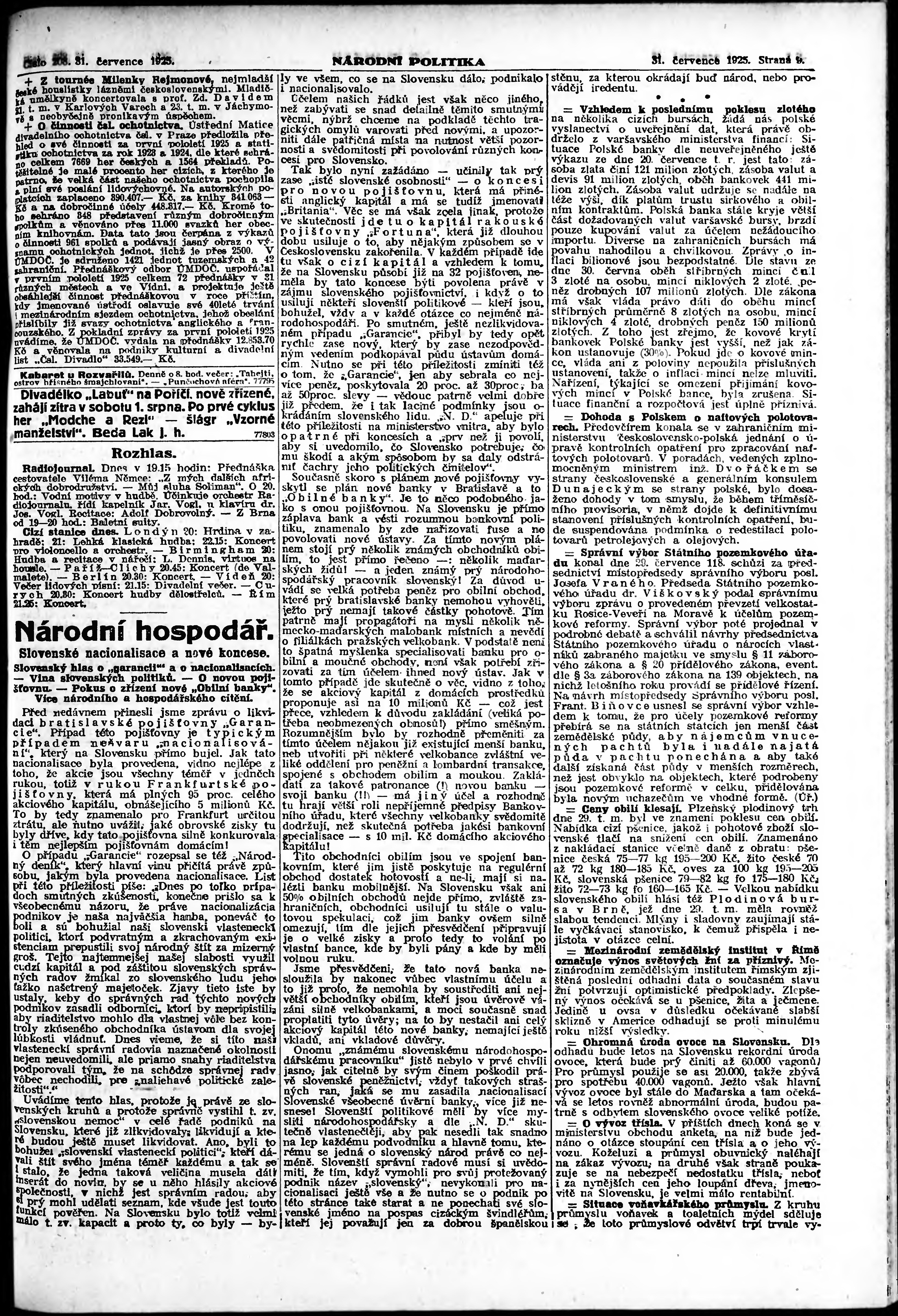 * Datum vydání výtisku: 31.7.1925 Číslo výtisku: 208 Poznámky k výtisku: ranní vydání; vydání pro Prahu;