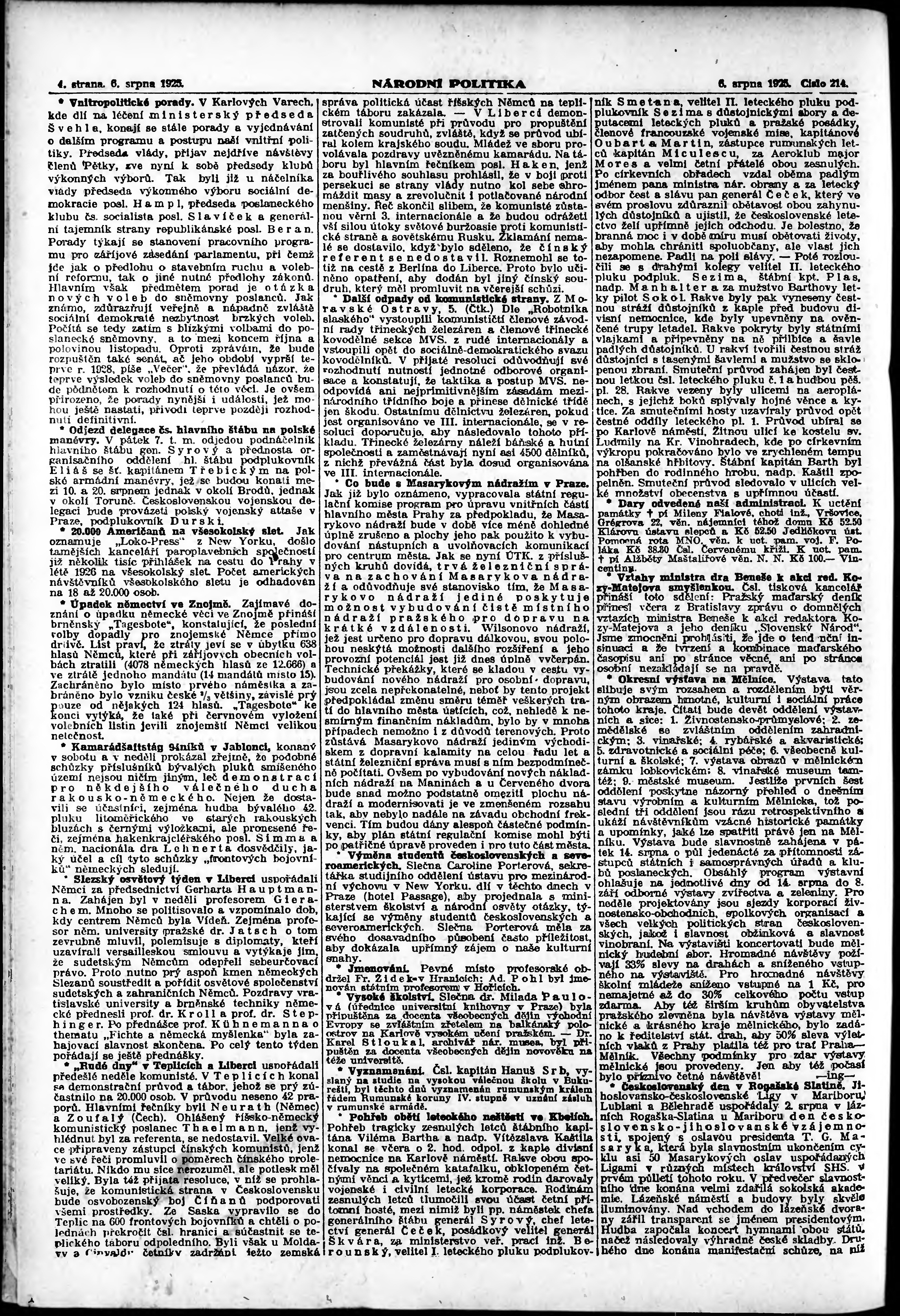 * Datum vydání výtisku: 6.8.1925 Číslo výtisku: 214 Poznámky k výtisku: ranní vydání; vydání pro Prahu;