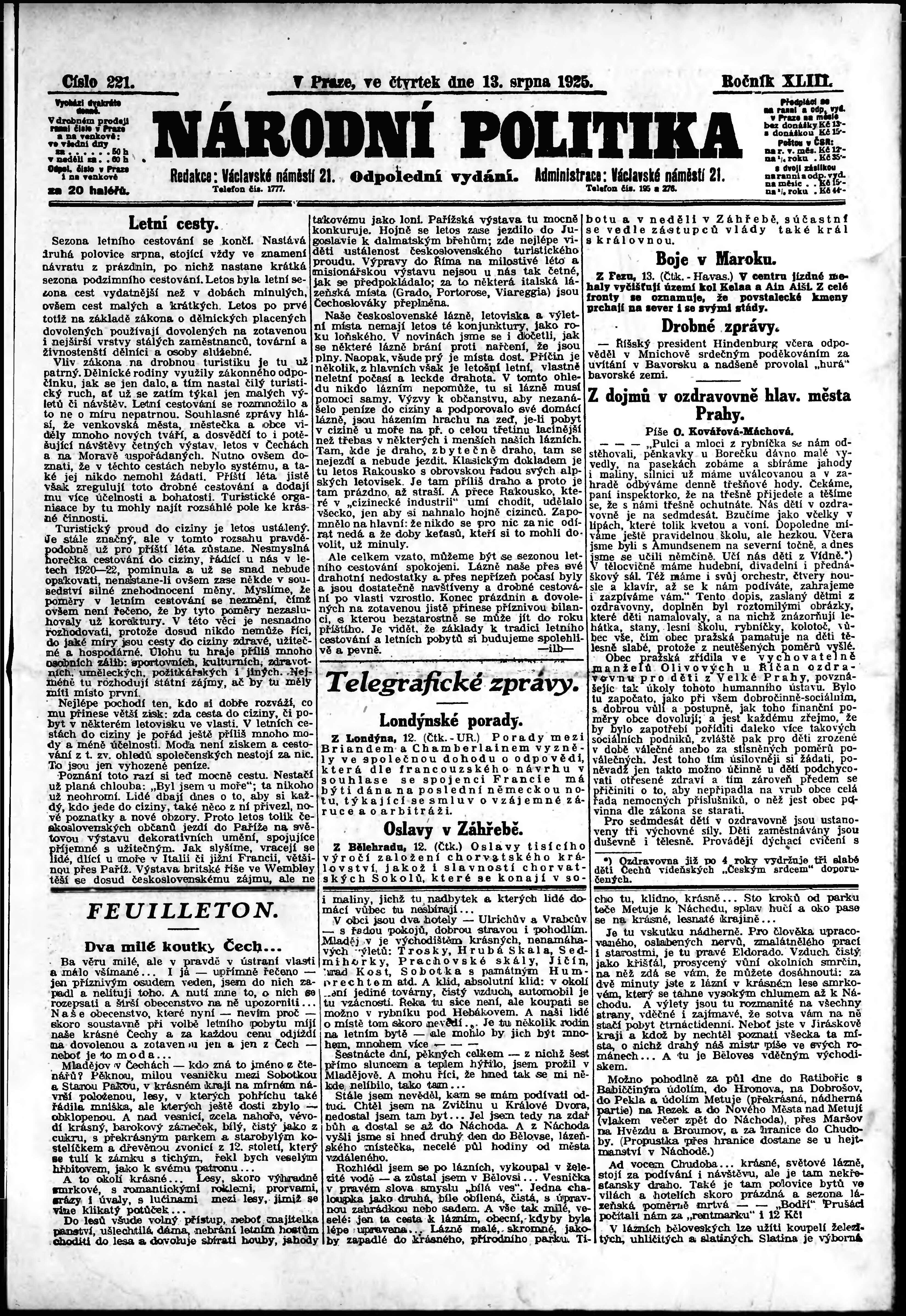 * Datum vydání výtisku: 13.8.1925 Číslo výtisku: 221 Poznámky k výtisku: odpolední vydání;