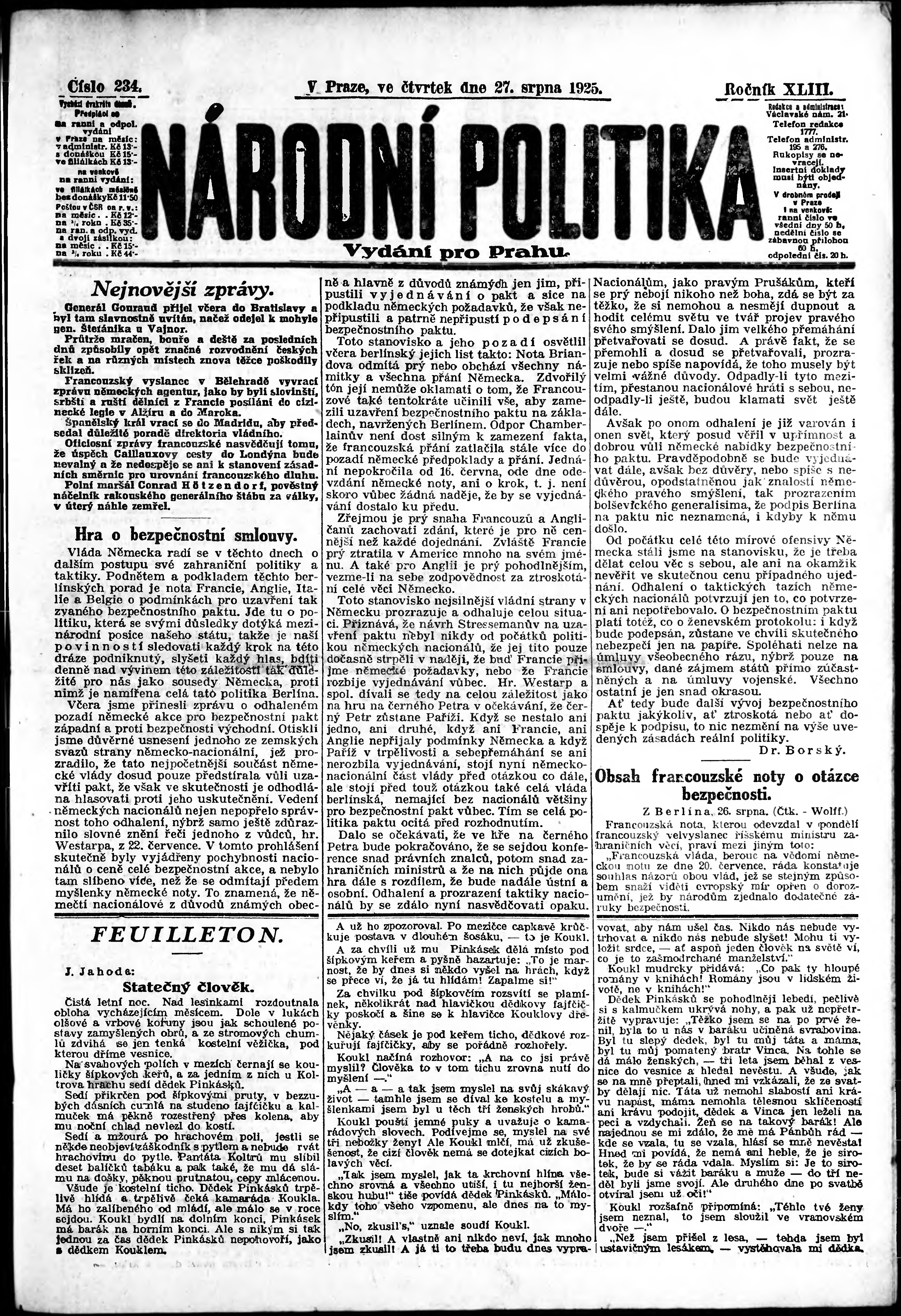* Datum vydání výtisku: 27.8.1925 Číslo výtisku: 234 Poznámky k výtisku: ranní vydání; vydání pro Prahu;