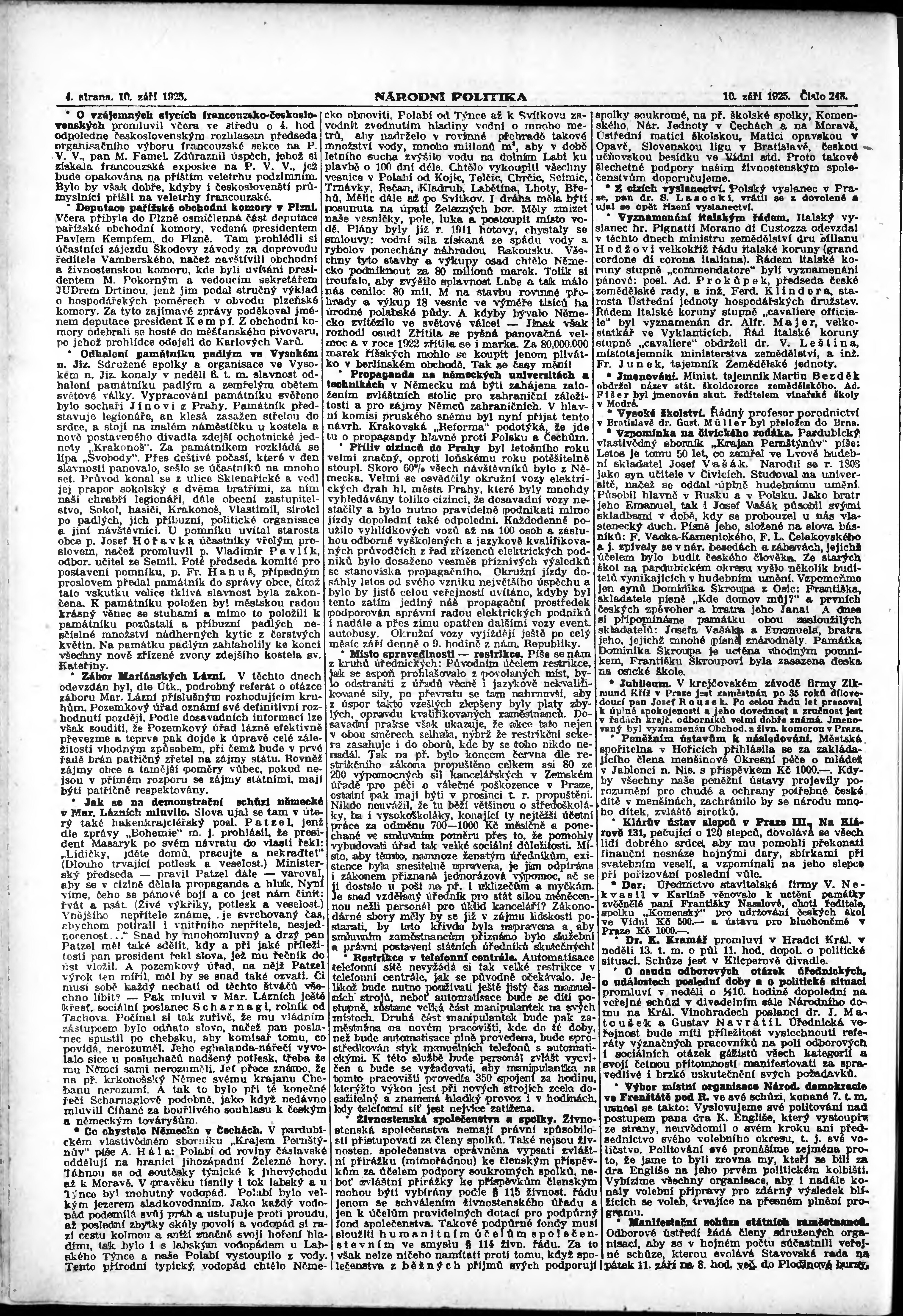 * Datum vydání výtisku: 10.9.1925 Číslo výtisku: 248 Poznámky k výtisku: ranní vydání; vydání pro Prahu; s. 5 - 8 není k dispozici;