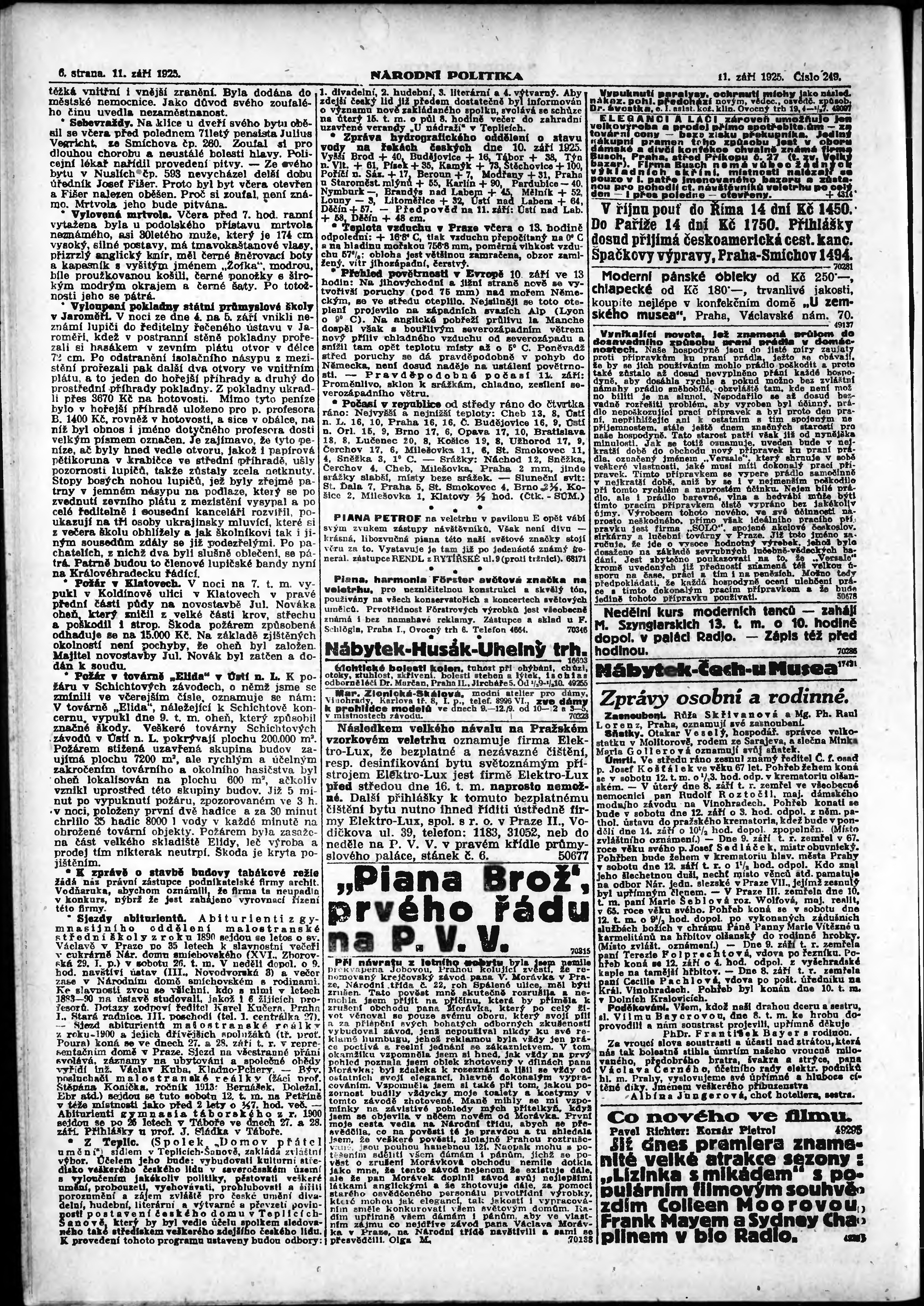 * Datum vydání výtisku: 11.9.1925 Číslo výtisku: 249 Poznámky k výtisku: ranní vydání; vydání pro Prahu;