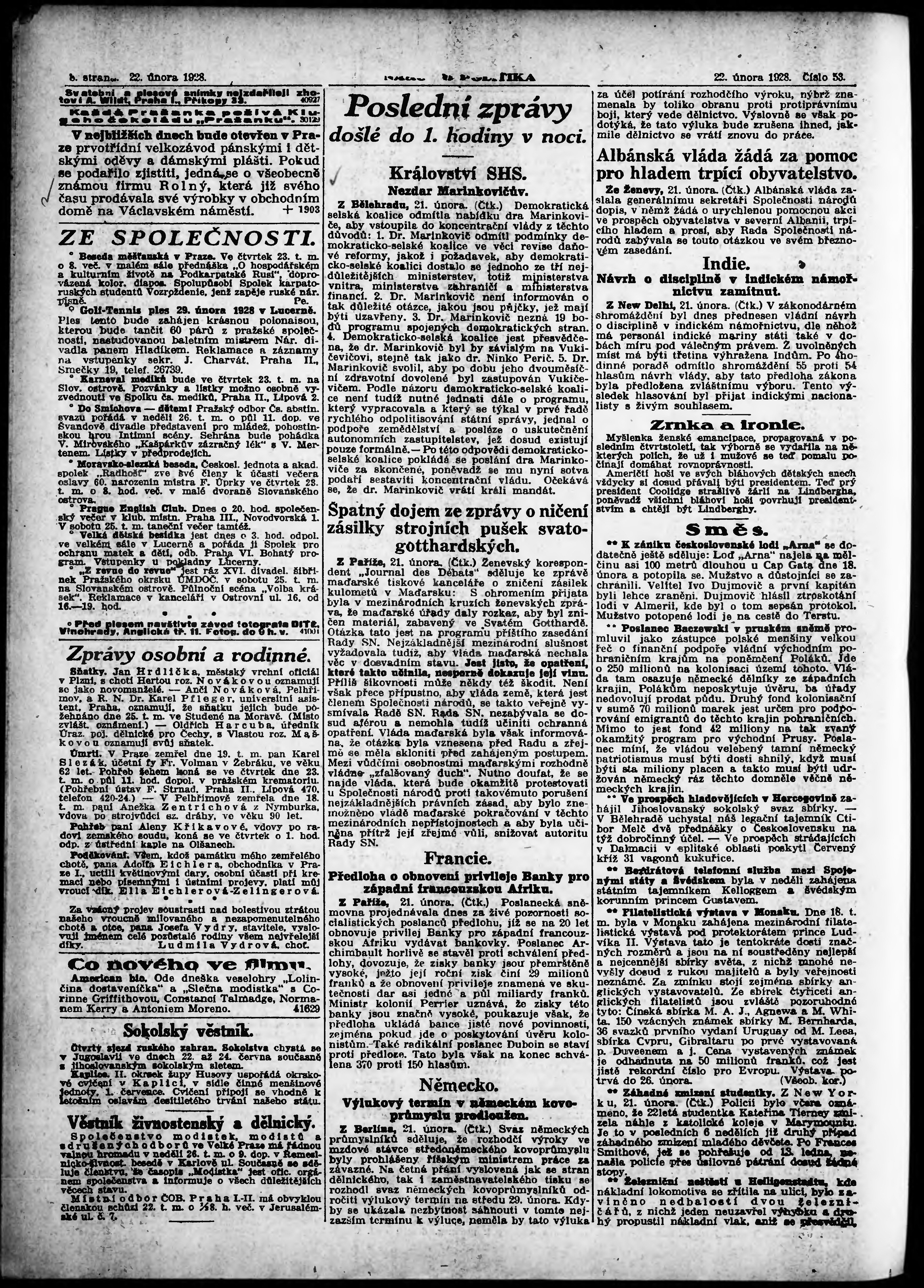 * Datum vydání výtisku: 22.2.1928 Číslo výtisku: 53 Poznámky k výtisku: ranní vydání; vydání pro Prahu;