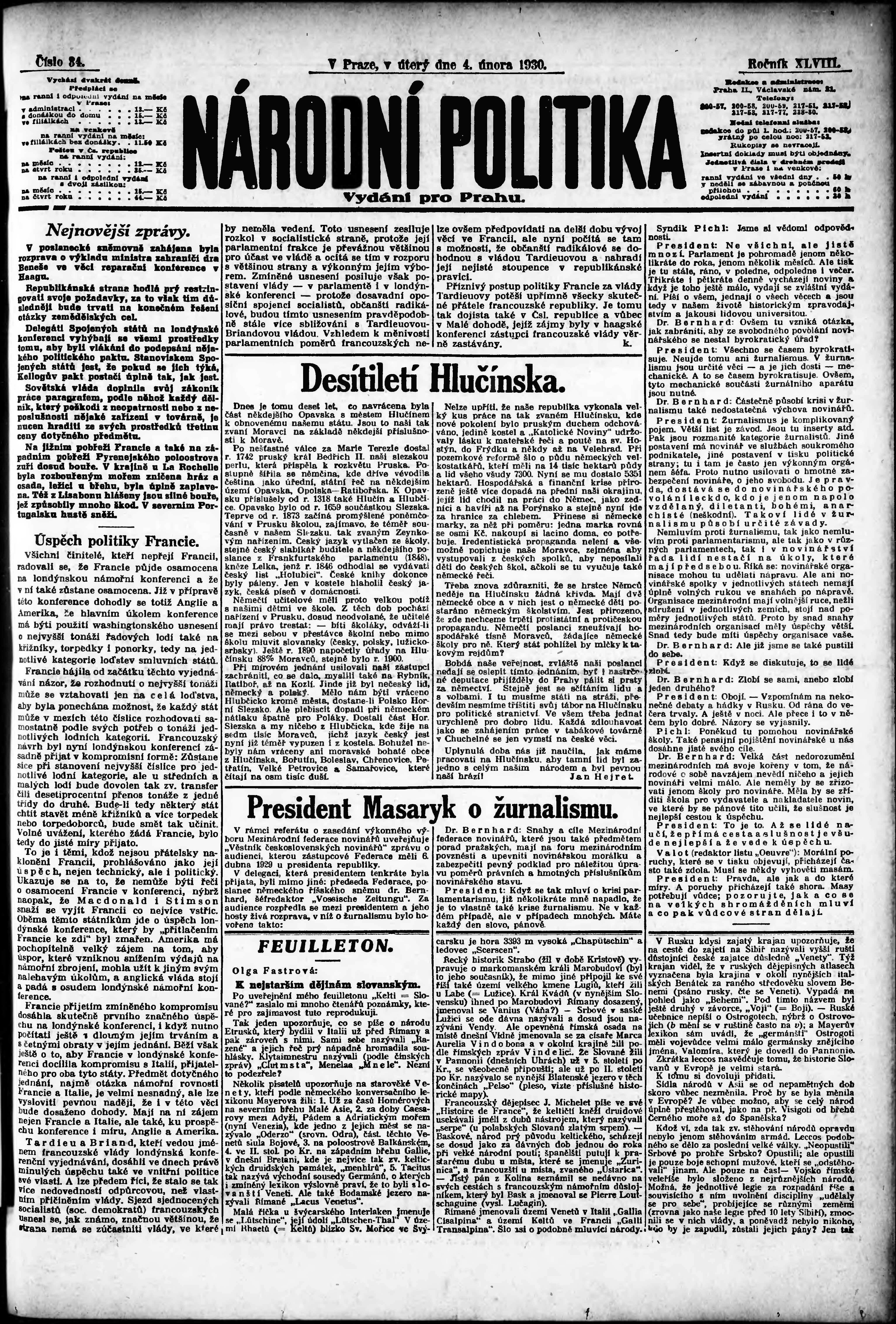 * Datum vydání výtisku: 4.2.1930 Číslo výtisku: 34 Poznámky k výtisku: ranní vydání; vydání pro Prahu;