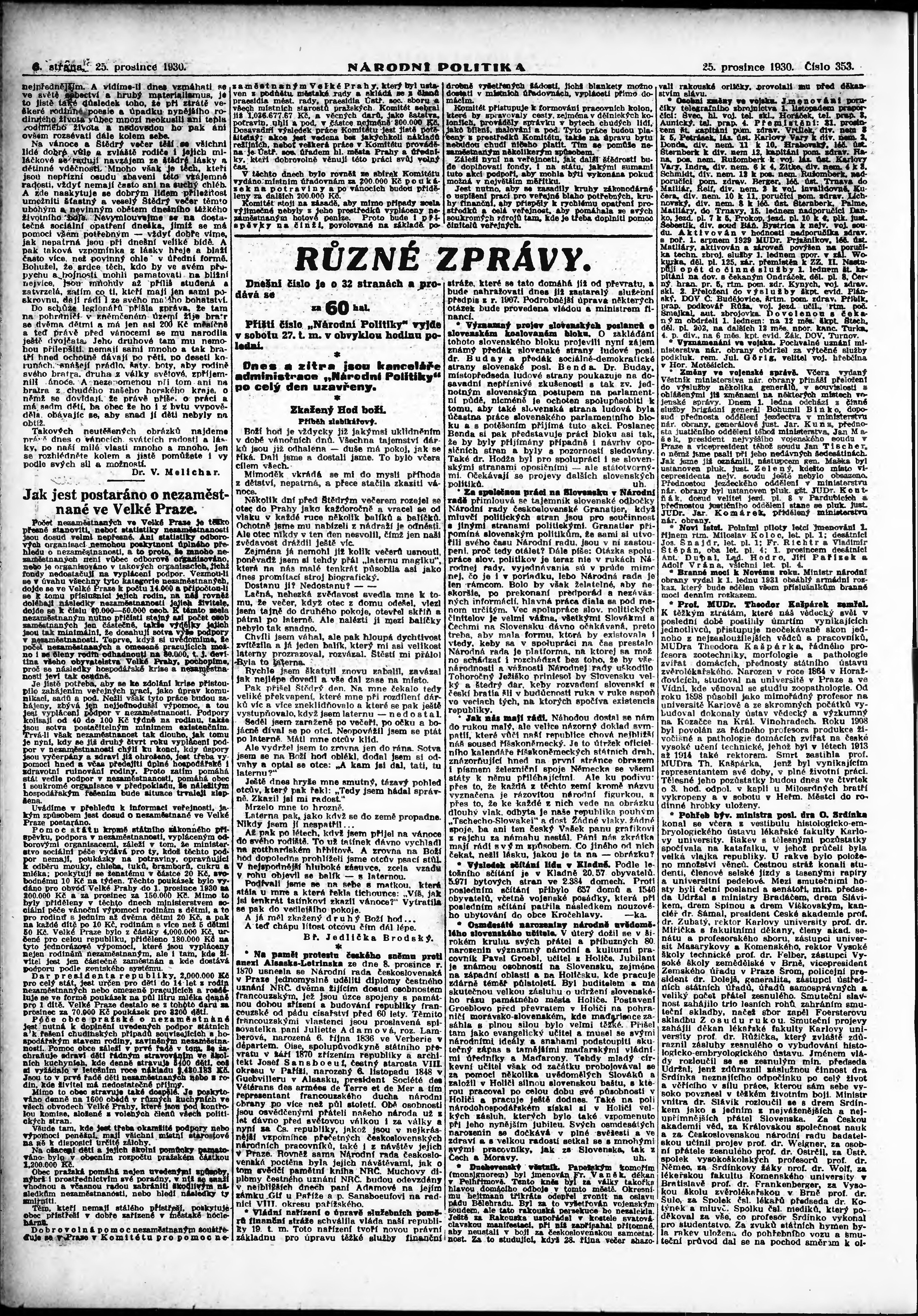 * Datum vydání výtisku: 25.12.1930 Číslo výtisku: 353 Poznámky k výtisku: ranní vydání;