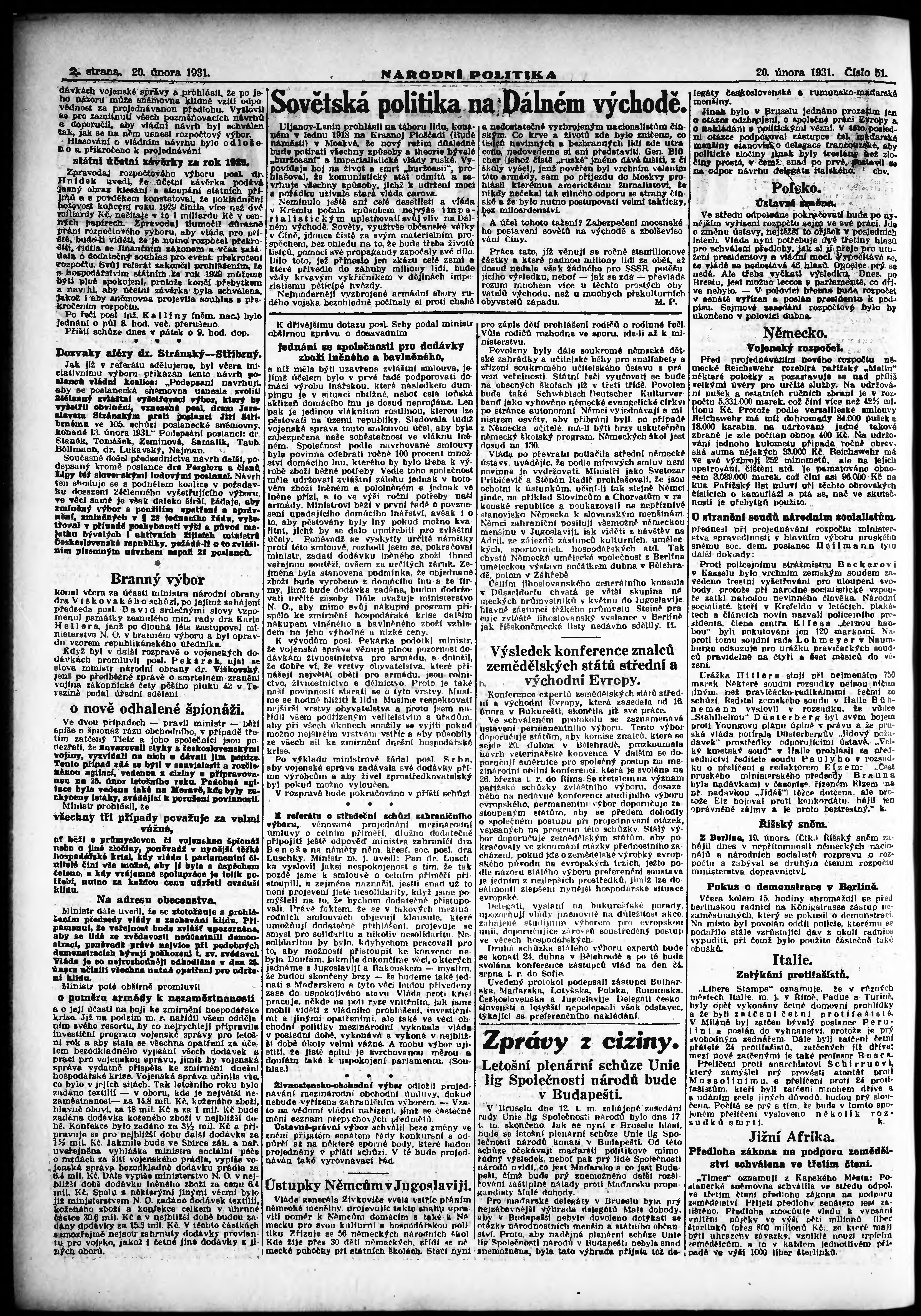 * Datum vydání výtisku: 20.2.1931 Číslo výtisku: 51 Poznámky k výtisku: ranní vydání; vydání pro Prahu;
