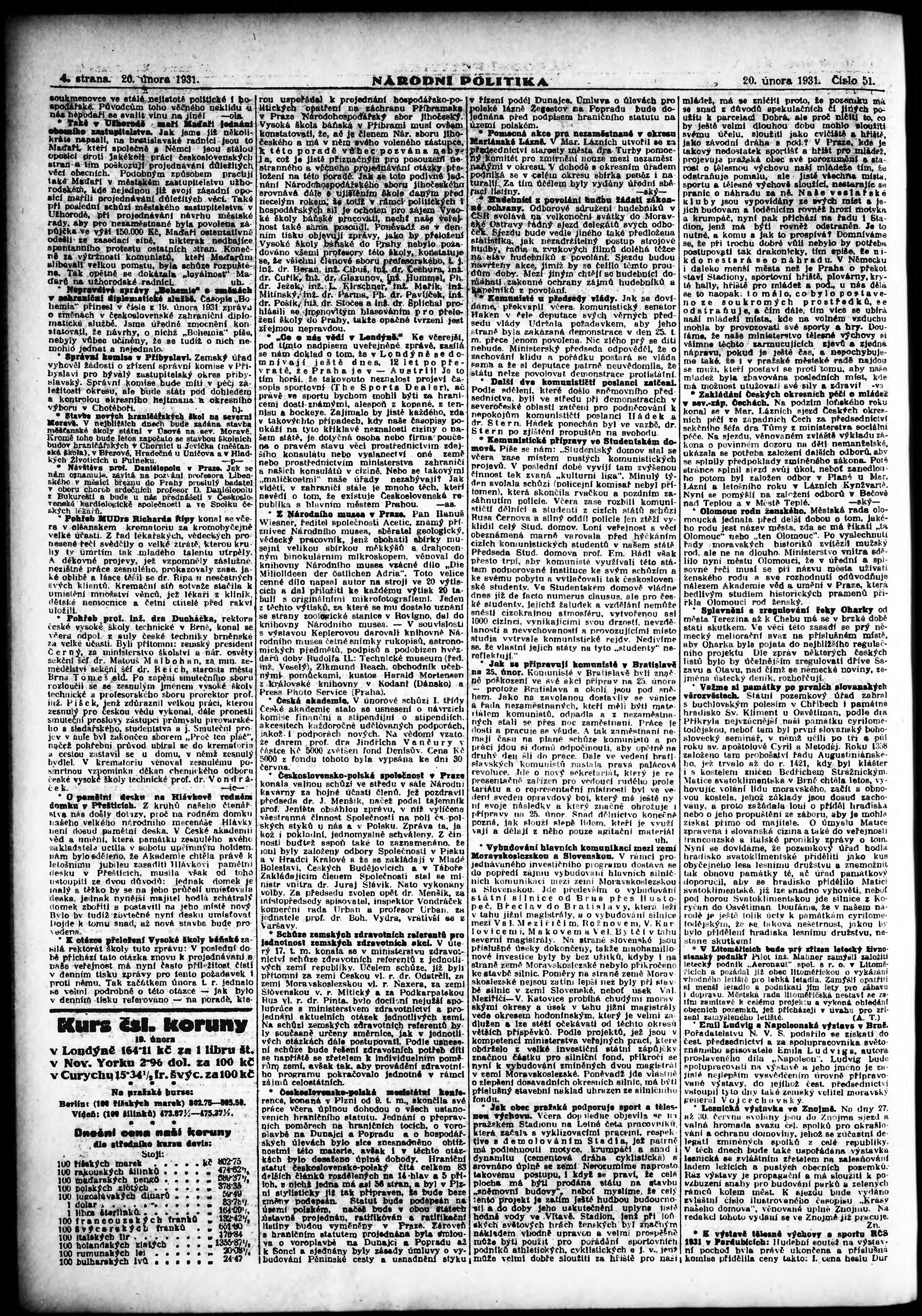 * Datum vydání výtisku: 20.2.1931 Číslo výtisku: 51 Poznámky k výtisku: ranní vydání; vydání pro Prahu;