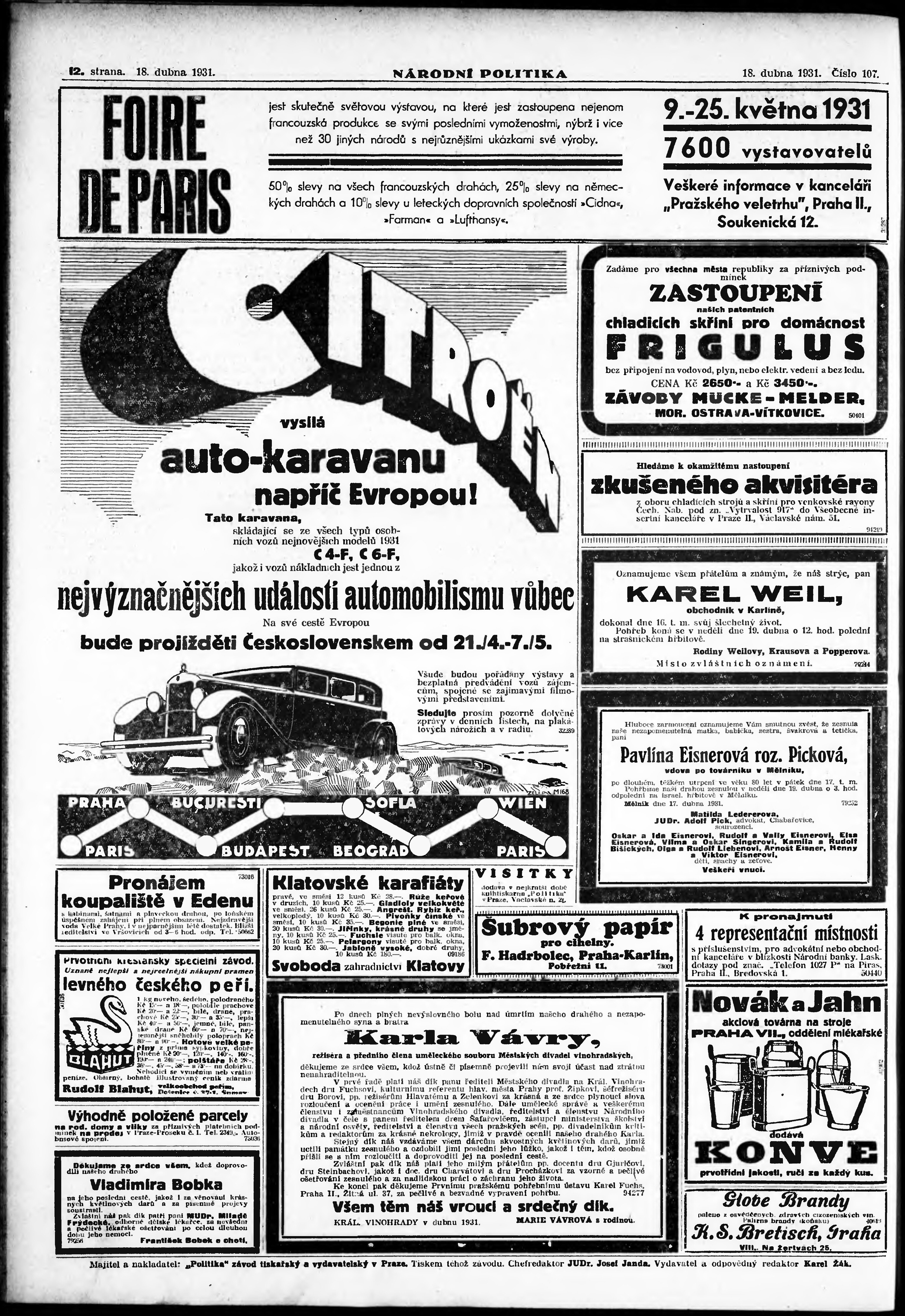 * Datum vydání výtisku: 18.4.1931 Číslo výtisku: 107 Poznámky k výtisku: ranní vydání; vydání pro Prahu;