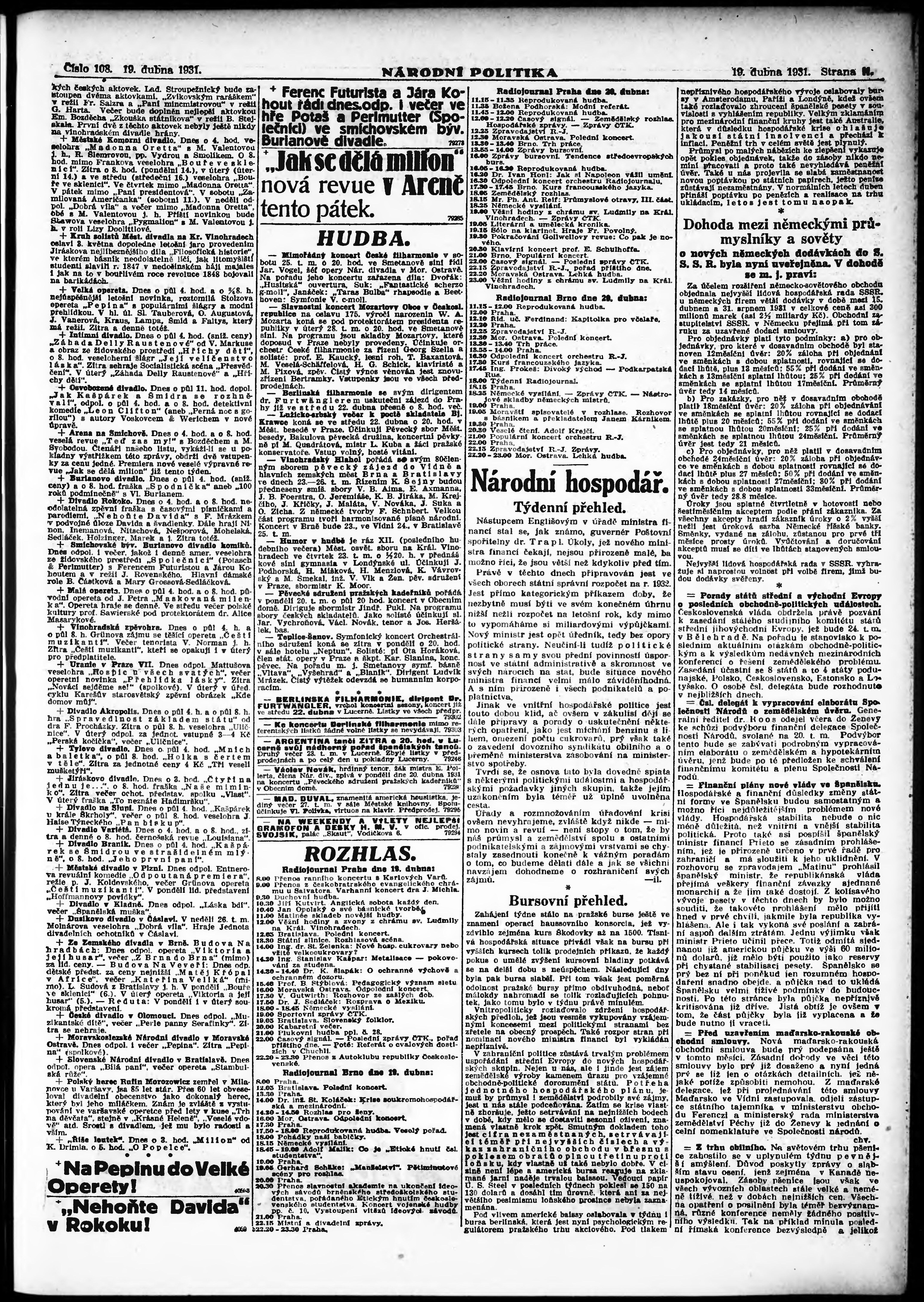 * Datum vydání výtisku: 19.4.1931 Číslo výtisku: 108 Poznámky k výtisku: ranní vydání;