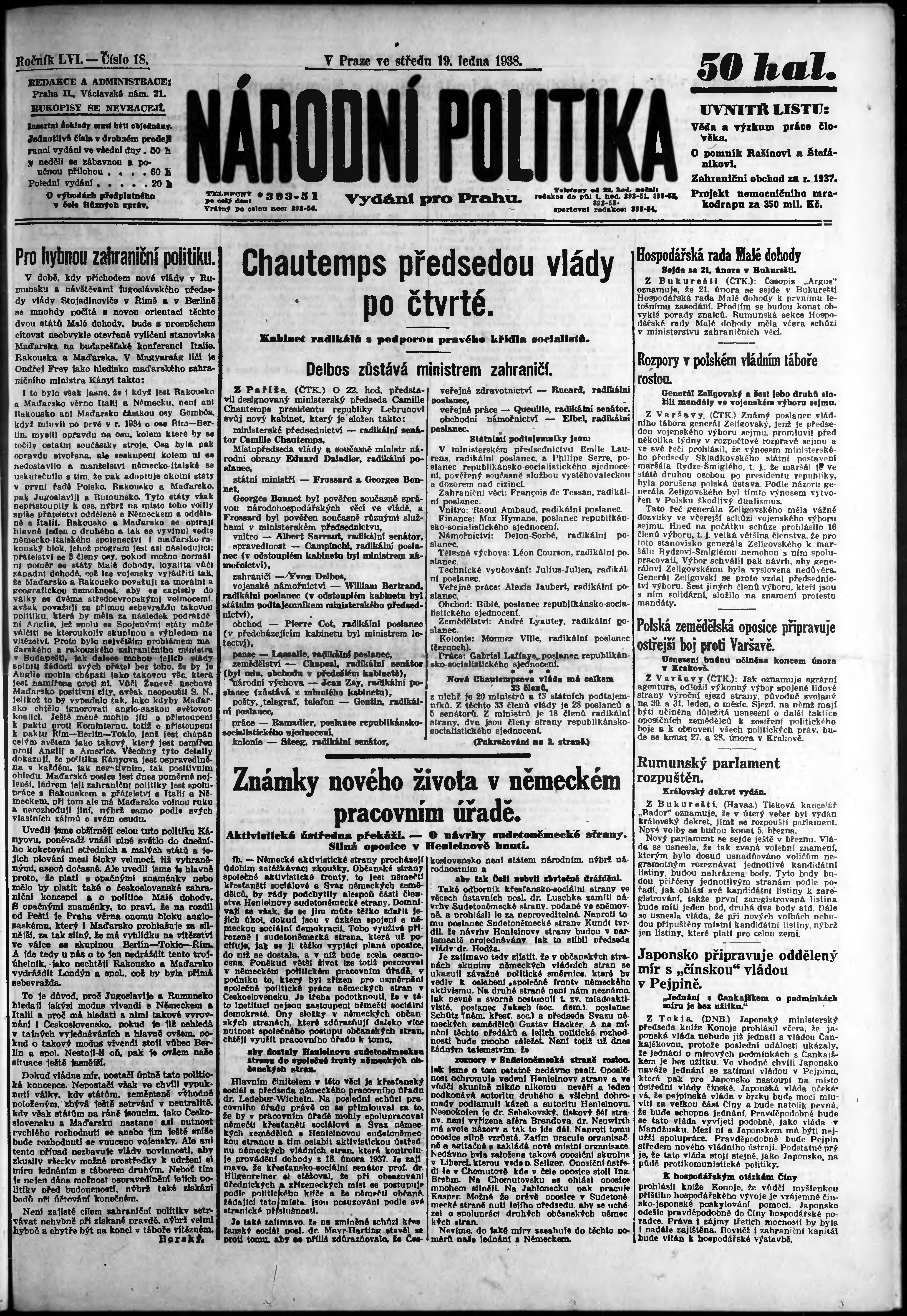 * Datum vydání výtisku: 19.1.1938 Číslo výtisku: 18 Poznámky k výtisku: ranní vydání; vydání pro Prahu;