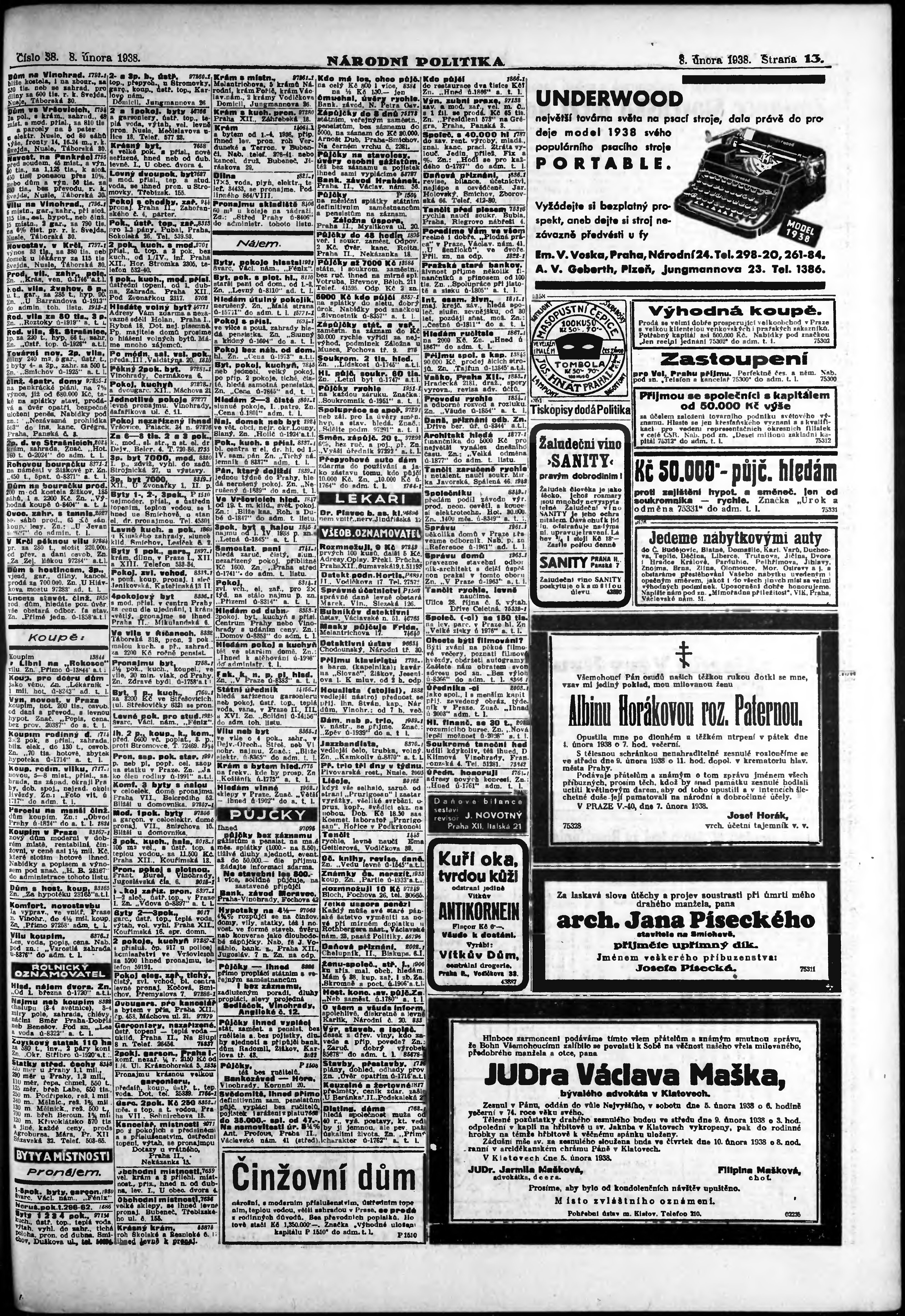 * Datum vydání výtisku: 8.2.1938 Číslo výtisku: 38 Poznámky k výtisku: ranní vydání; vydání pro Prahu;