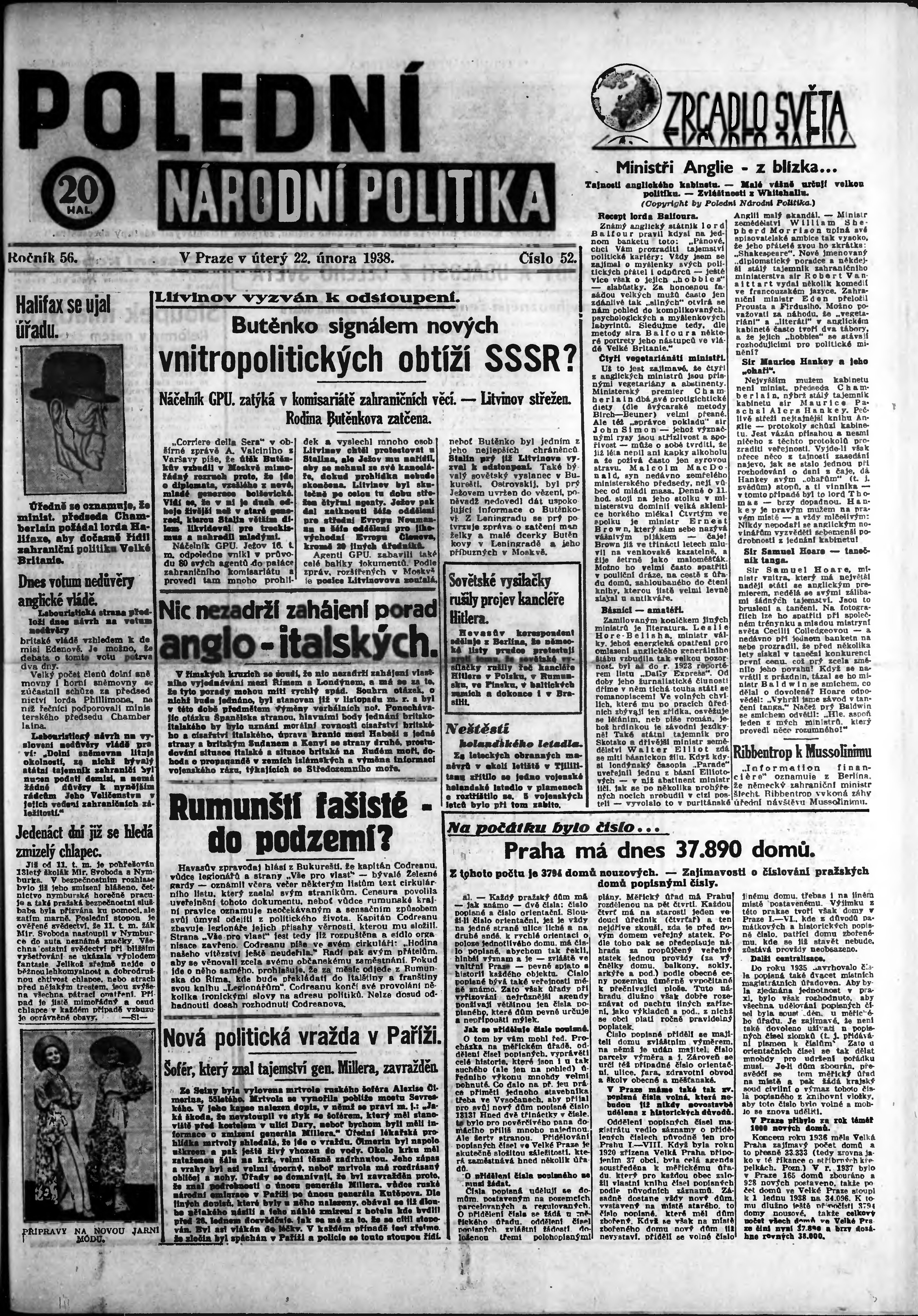 * Datum vydání výtisku: 22.2.1938 Číslo výtisku: 52 Poznámky k výtisku: polední vydání;