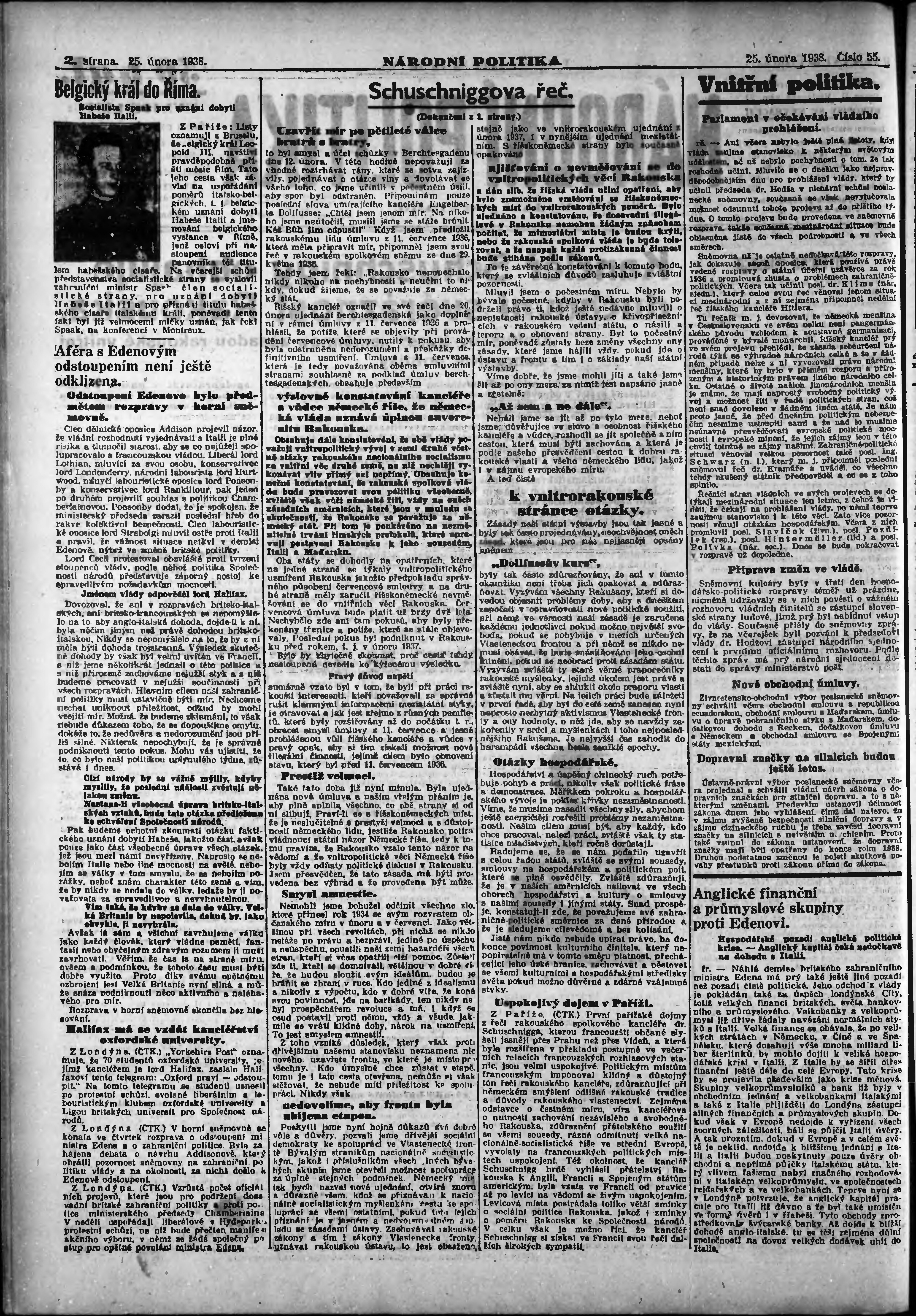 * Datum vydání výtisku: 25.2.1938 Číslo výtisku: 55 Poznámky k výtisku: ranní vydání; vydání pro Prahu;