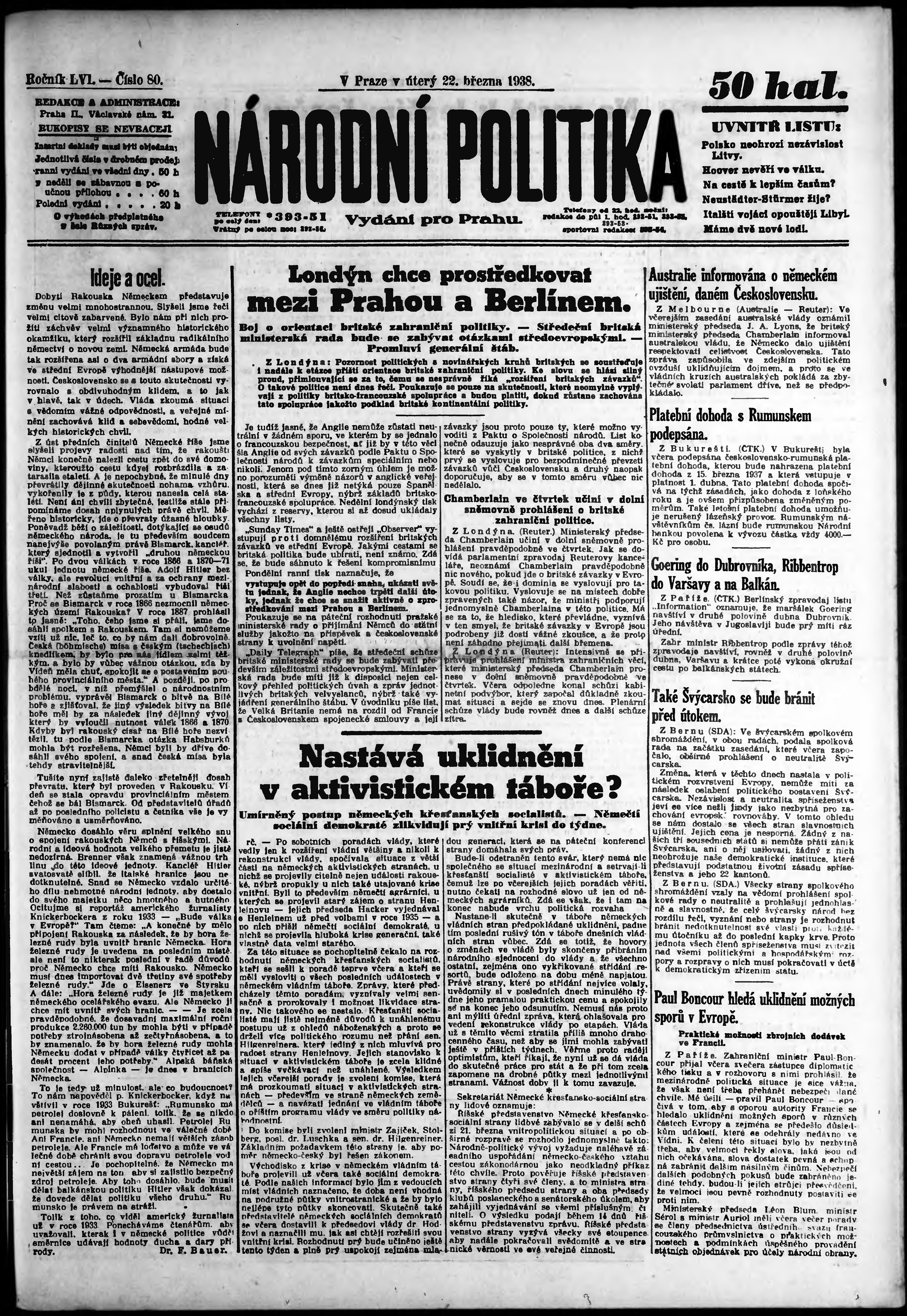 * Datum vydání výtisku: 22.3.1938 Číslo výtisku: 80 Poznámky k výtisku: ranní vydání; vydání pro Prahu;