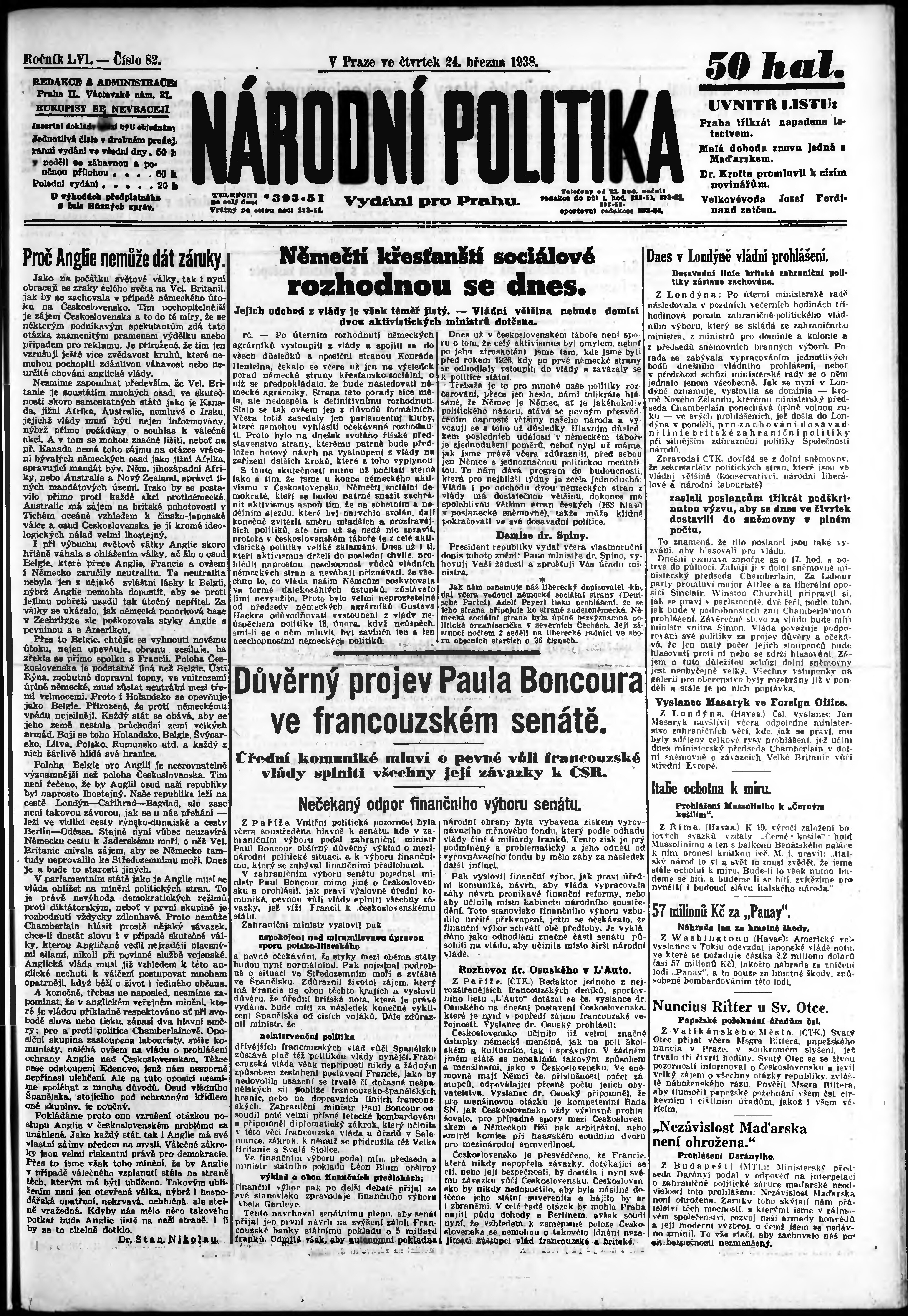 * Datum vydání výtisku: 24.3.1938 Číslo výtisku: 82 Poznámky k výtisku: ranní vydání; vydání pro Prahu;