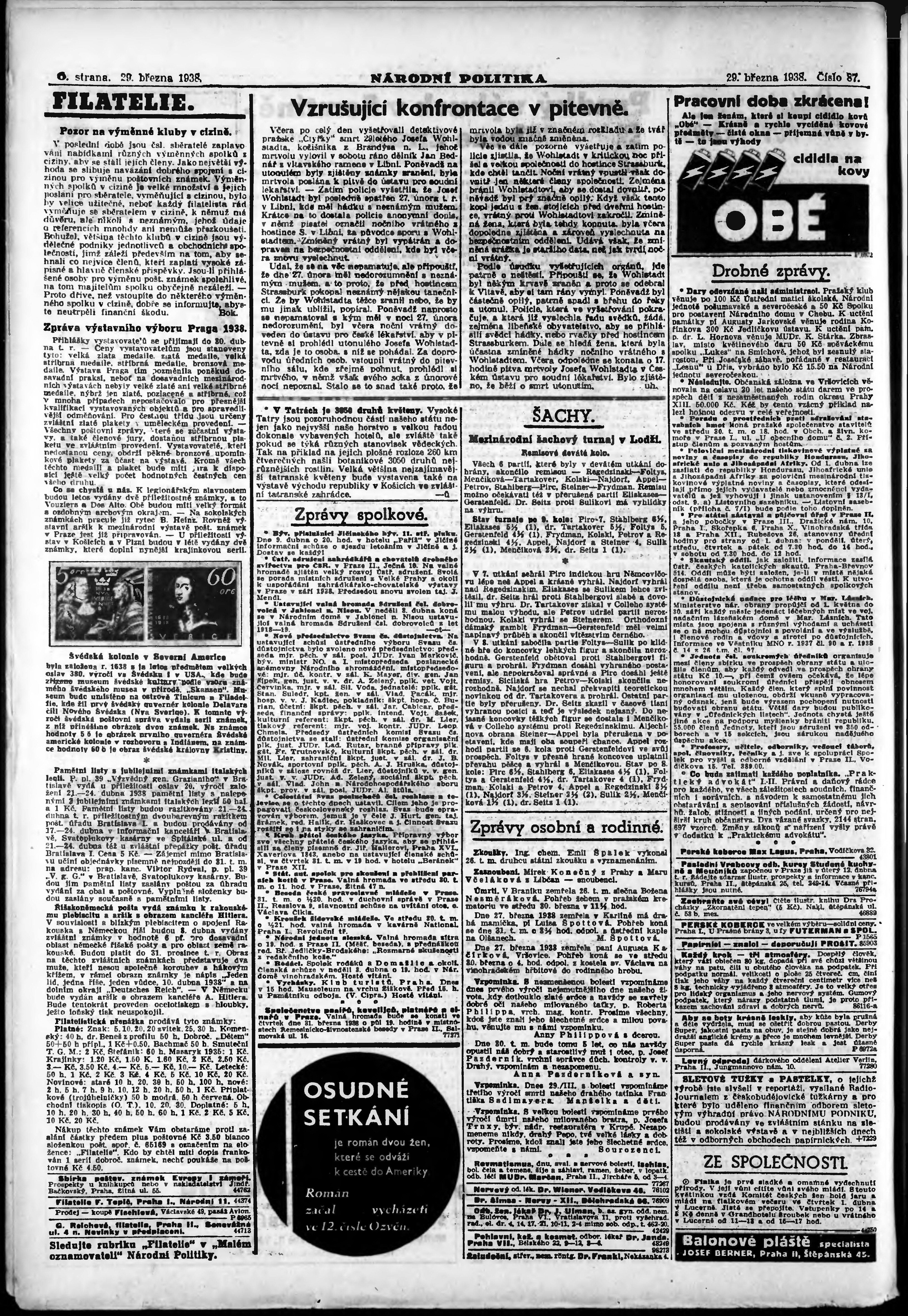 * Datum vydání výtisku: 29.3.1938 Číslo výtisku: 87 Poznámky k výtisku: ranní vydání; vydání pro Prahu;
