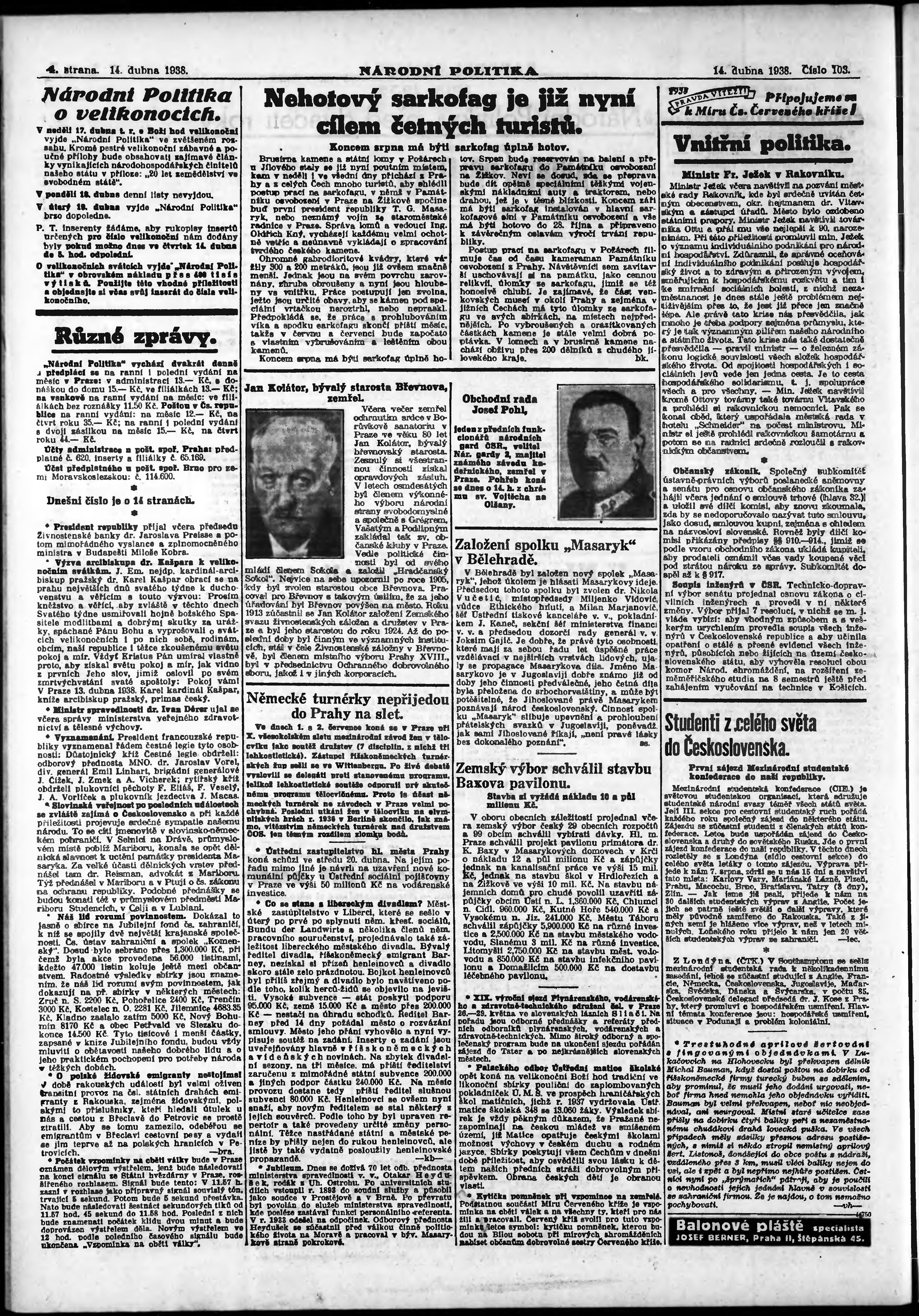 * Datum vydání výtisku: 14.4.1938 Číslo výtisku: 103 Poznámky k výtisku: ranní vydání; vydání pro Prahu;