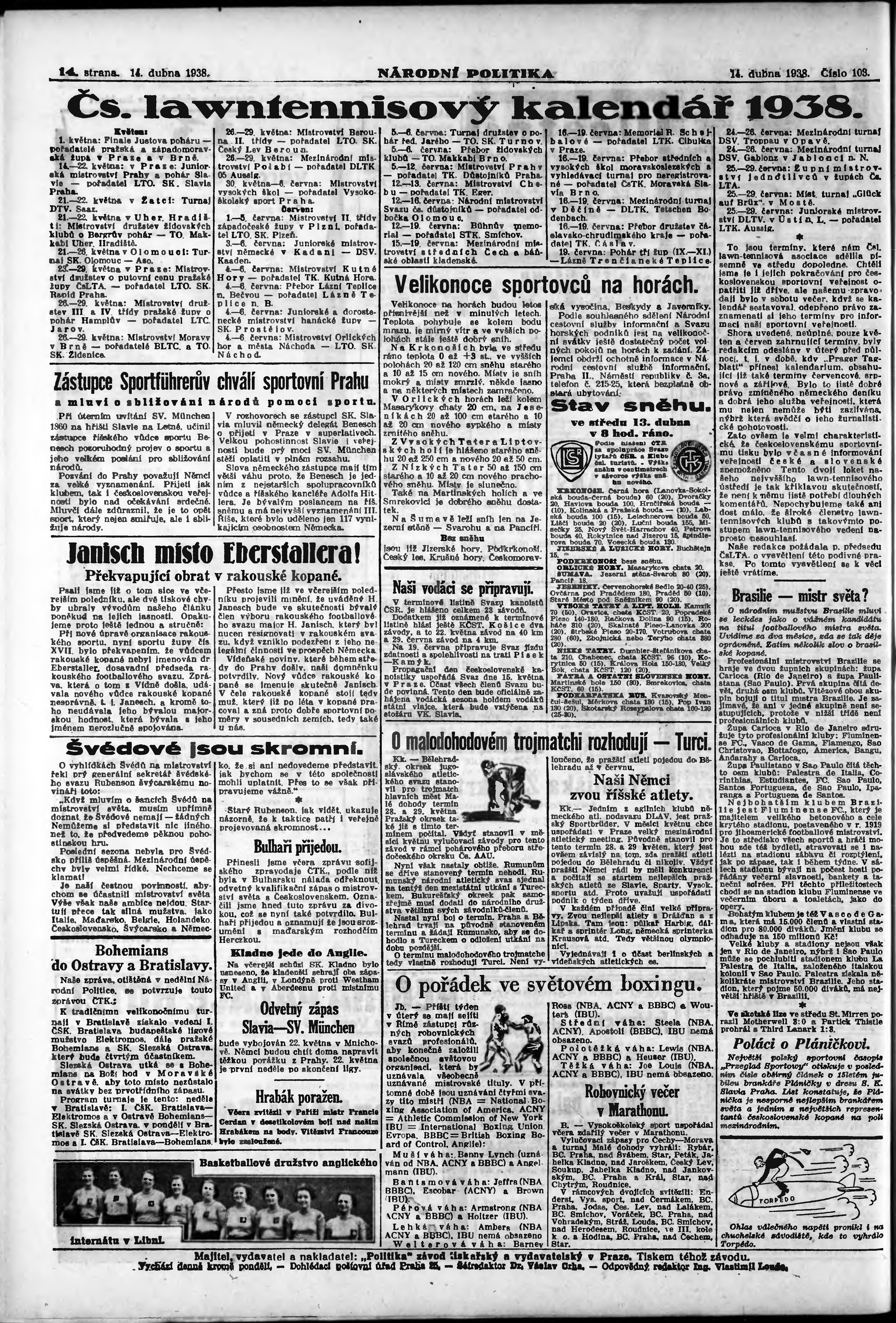 * Datum vydání výtisku: 14.4.1938 Číslo výtisku: 103 Poznámky k výtisku: ranní vydání; vydání pro Prahu;