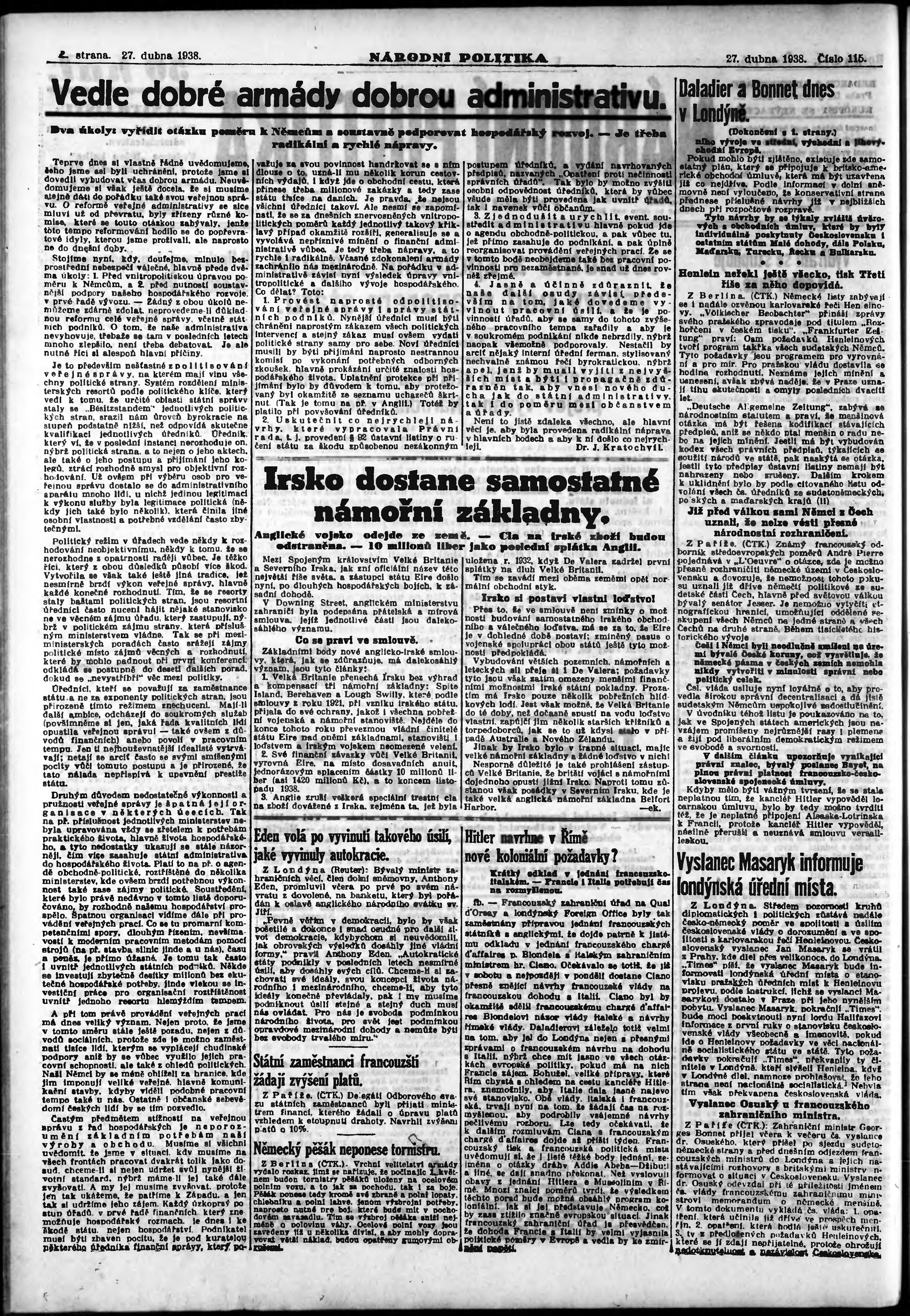 * Datum vydání výtisku: 27.4.1938 Číslo výtisku: 115 Poznámky k výtisku: ranní vydání; vydání pro Prahu;