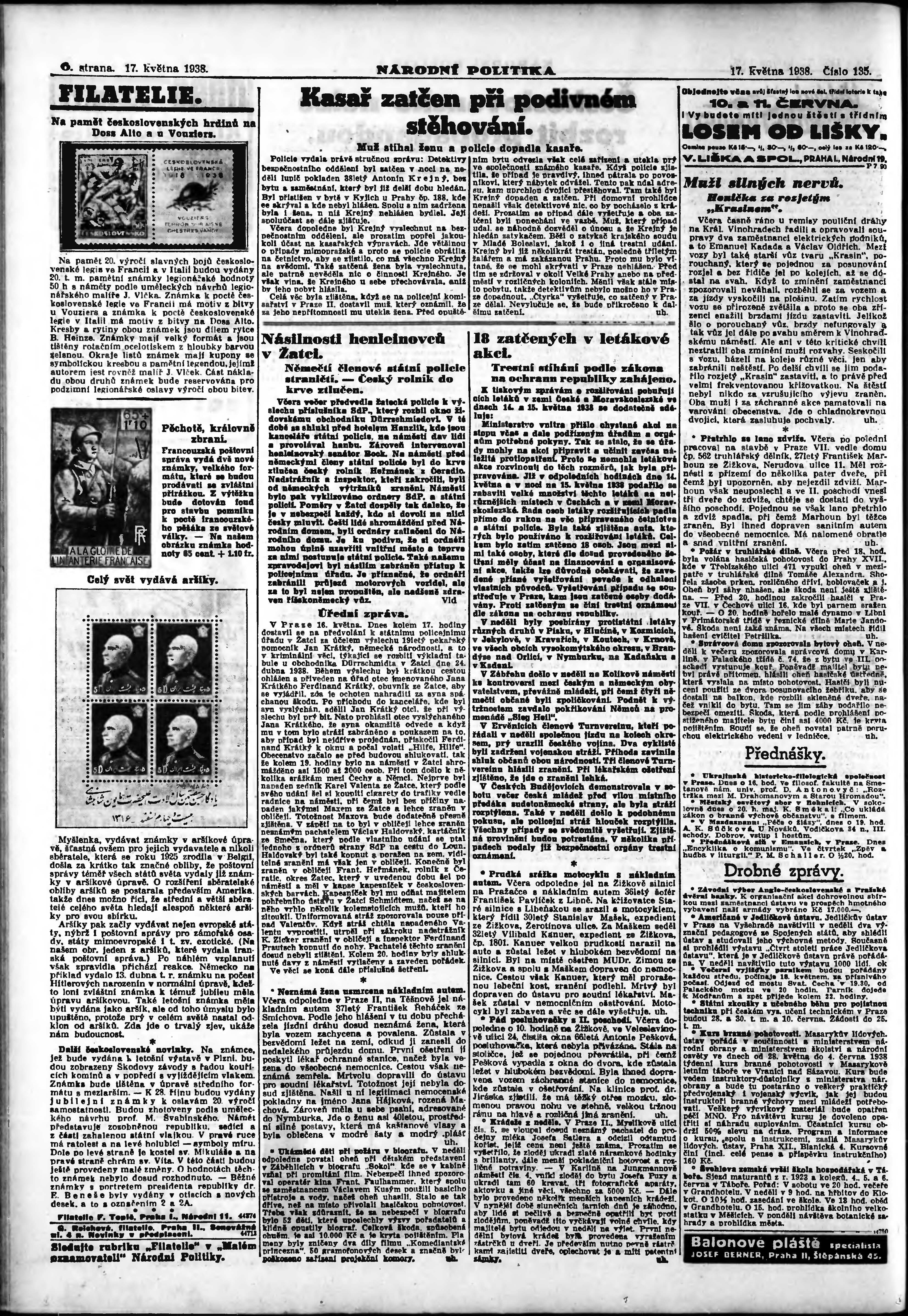* Datum vydání výtisku: 17.5.1938 Číslo výtisku: 135 Poznámky k výtisku: ranní vydání; vydání pro Prahu;