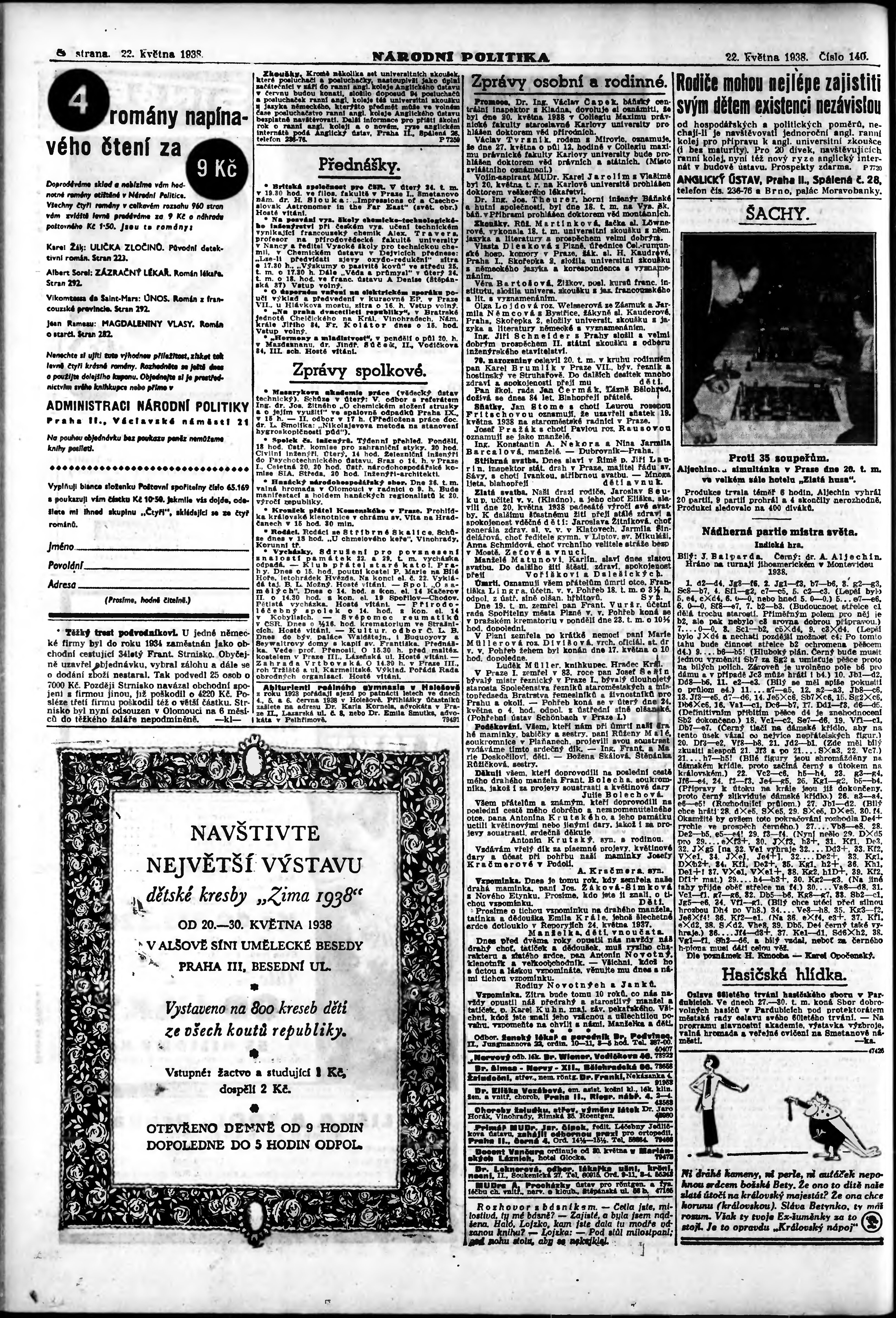 * Datum vydání výtisku: 22.5.1938 Číslo výtisku: 140 Poznámky k výtisku: ranní vydání;