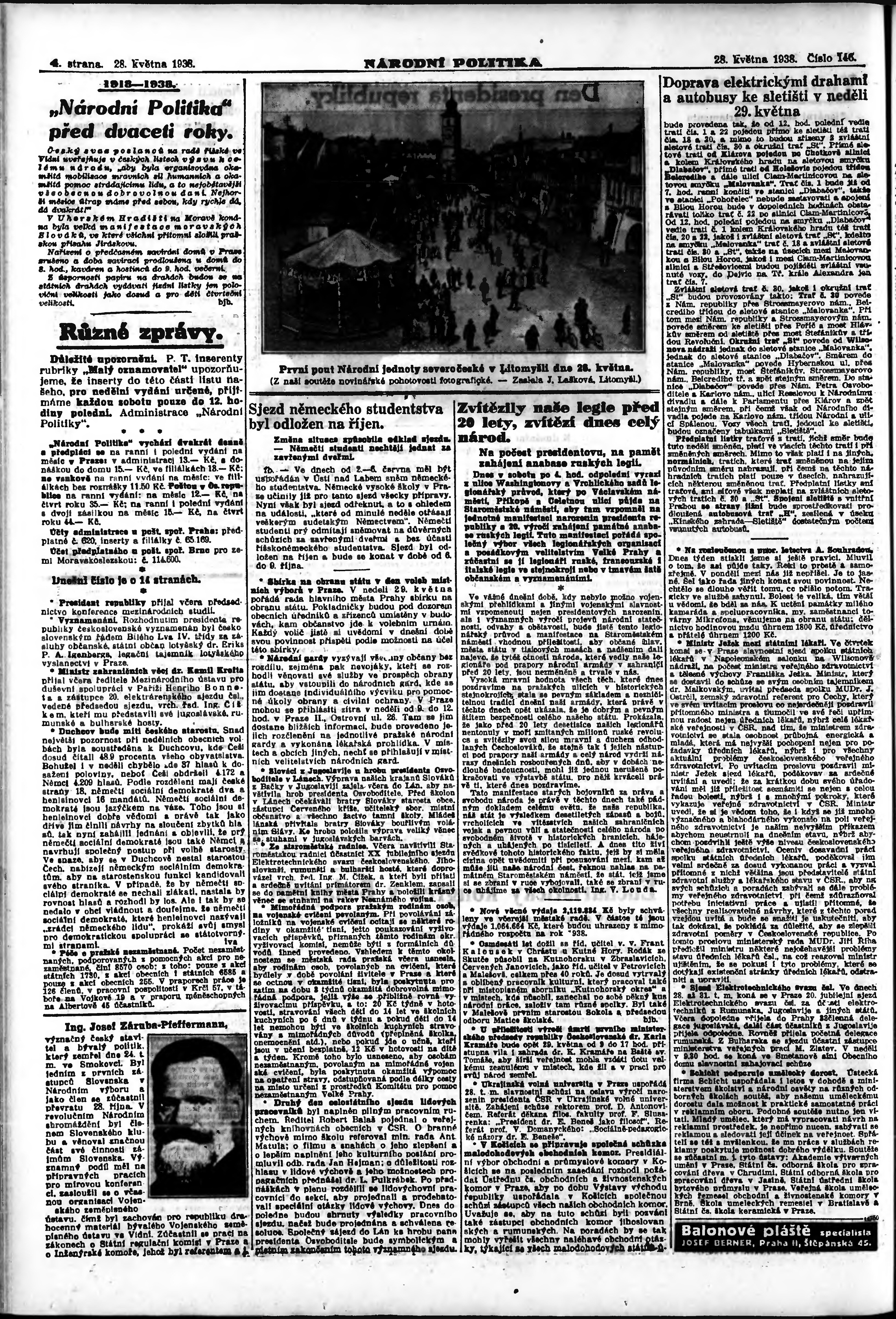 * Datum vydání výtisku: 28.5.1938 Číslo výtisku: 146 Poznámky k výtisku: ranní vydání; vydání pro Prahu;