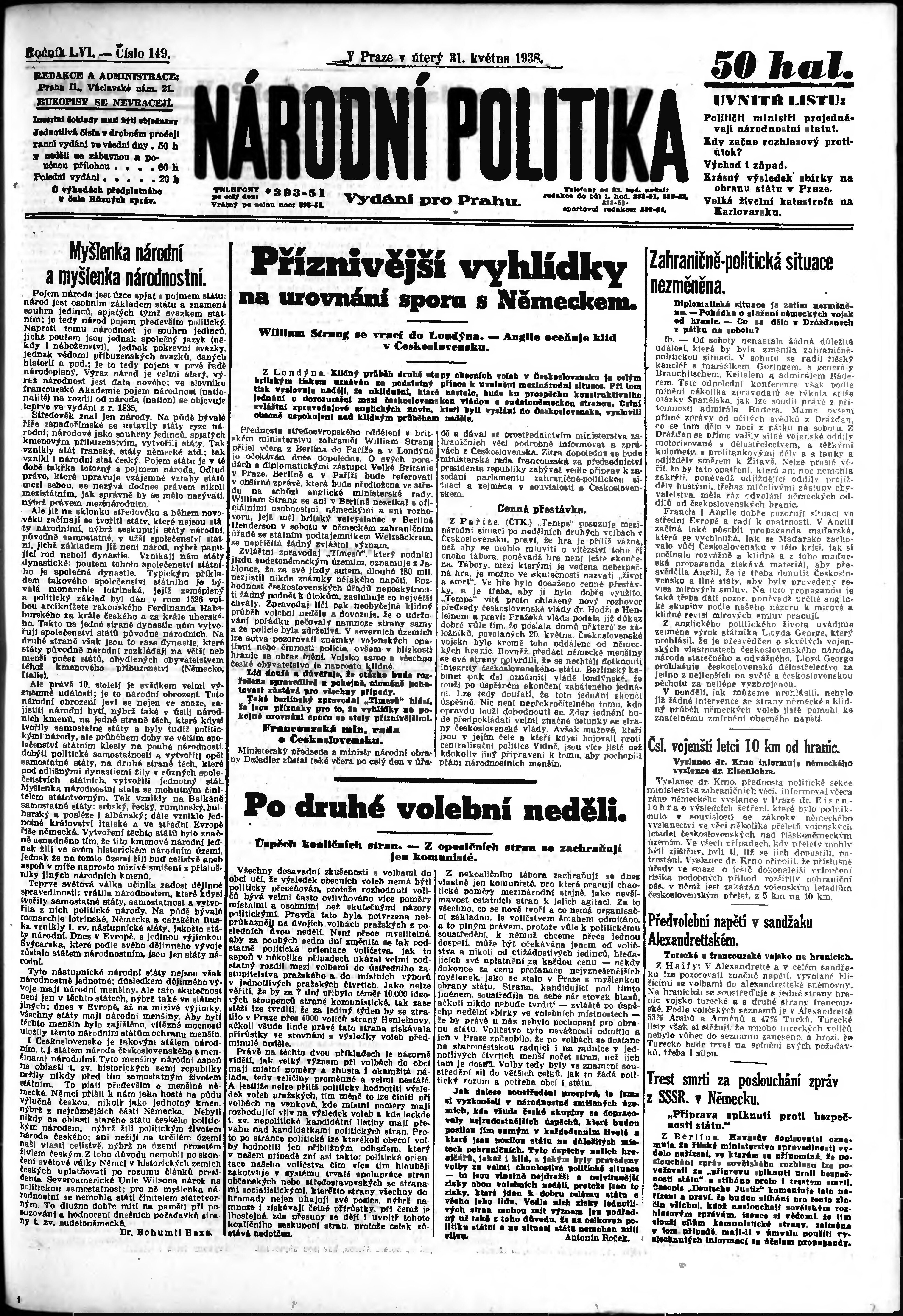 * Datum vydání výtisku: 31.5.1938 Číslo výtisku: 149 Poznámky k výtisku: ranní vydání; vydání pro Prahu;