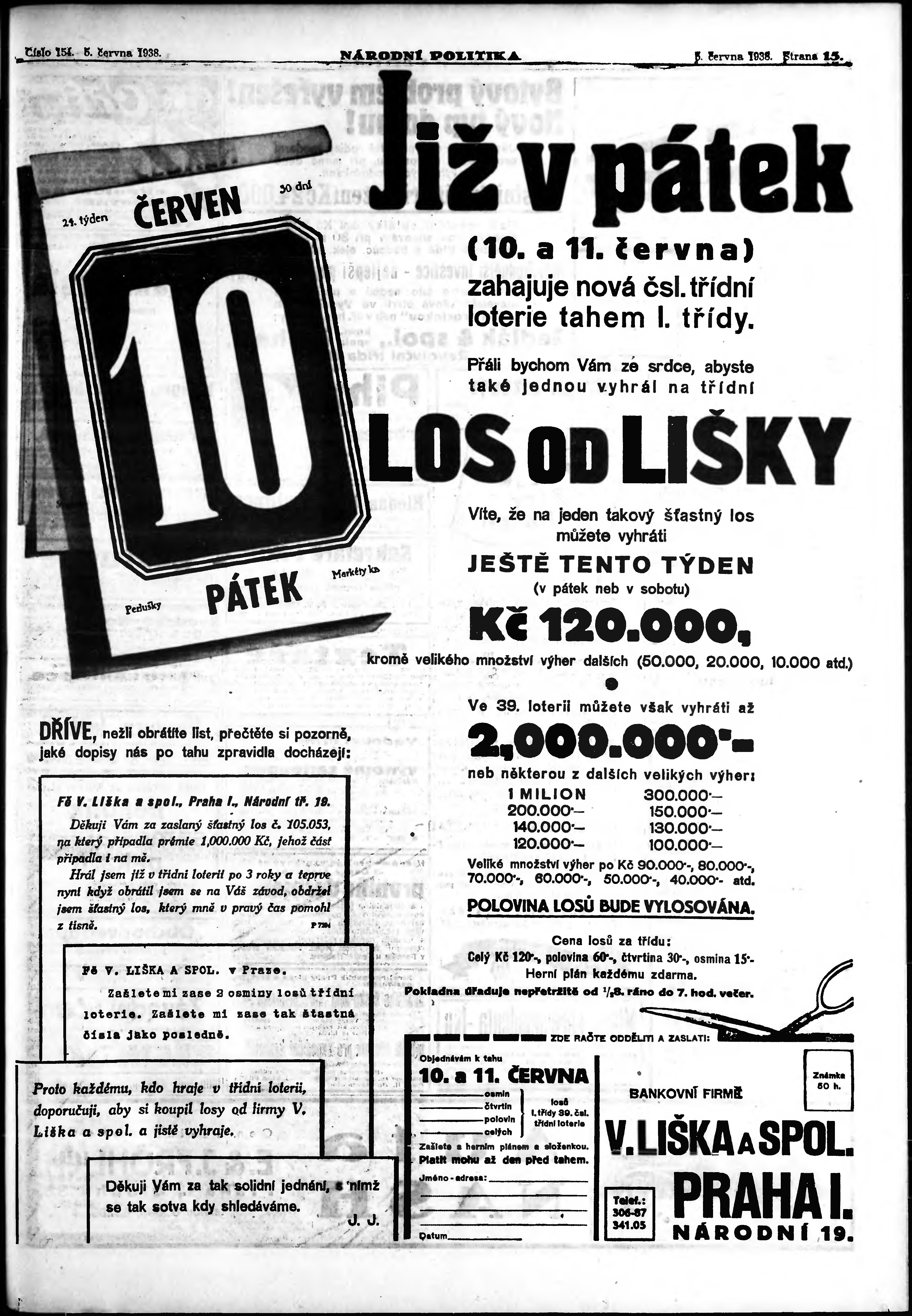 * Datum vydání výtisku: 5.6.1938 Číslo výtisku: 154 Poznámky k výtisku: ranní vydání;