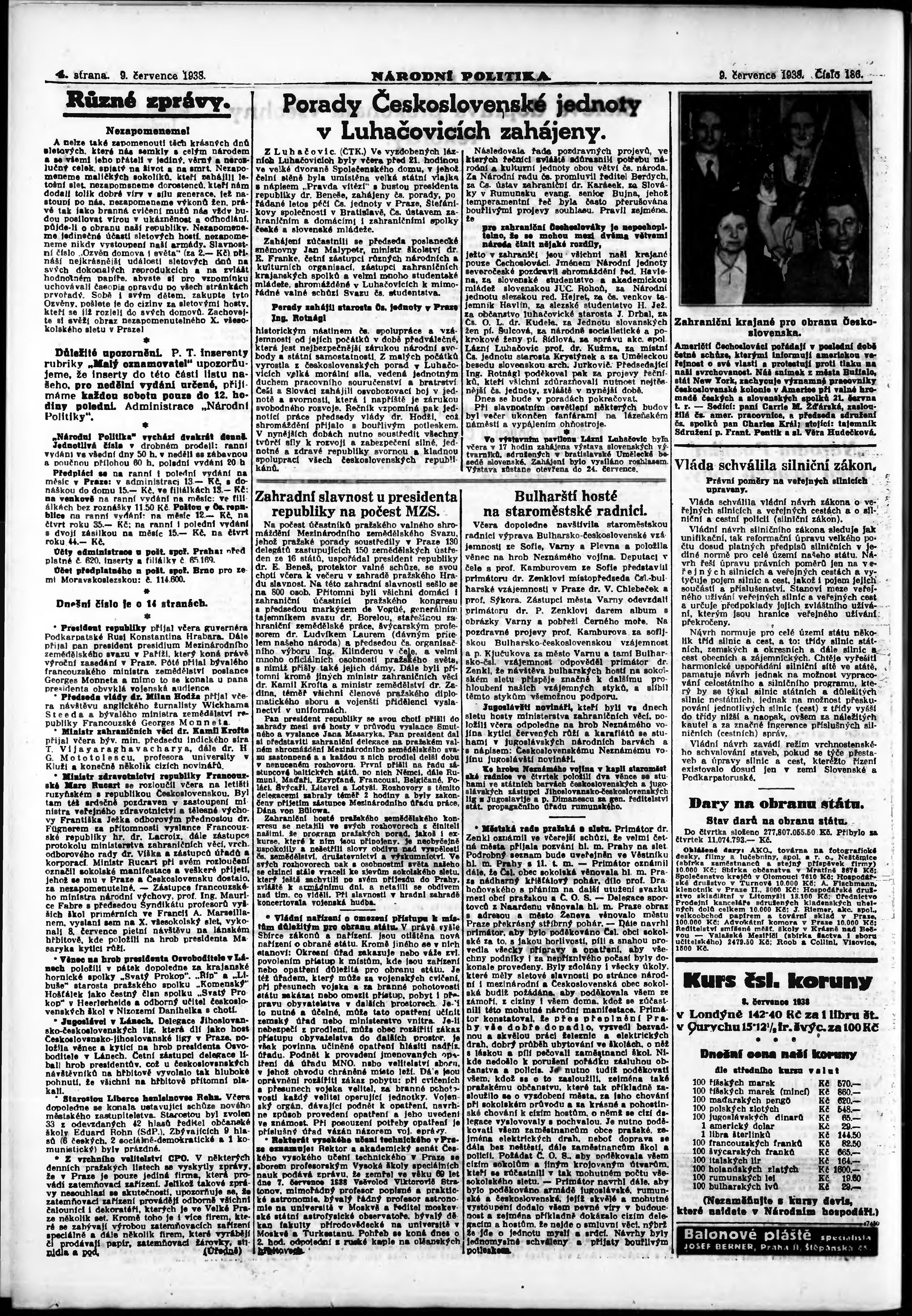 * Datum vydání výtisku: 9.7.1938 Číslo výtisku: 186 Poznámky k výtisku: ranní vydání; vydání pro Prahu;