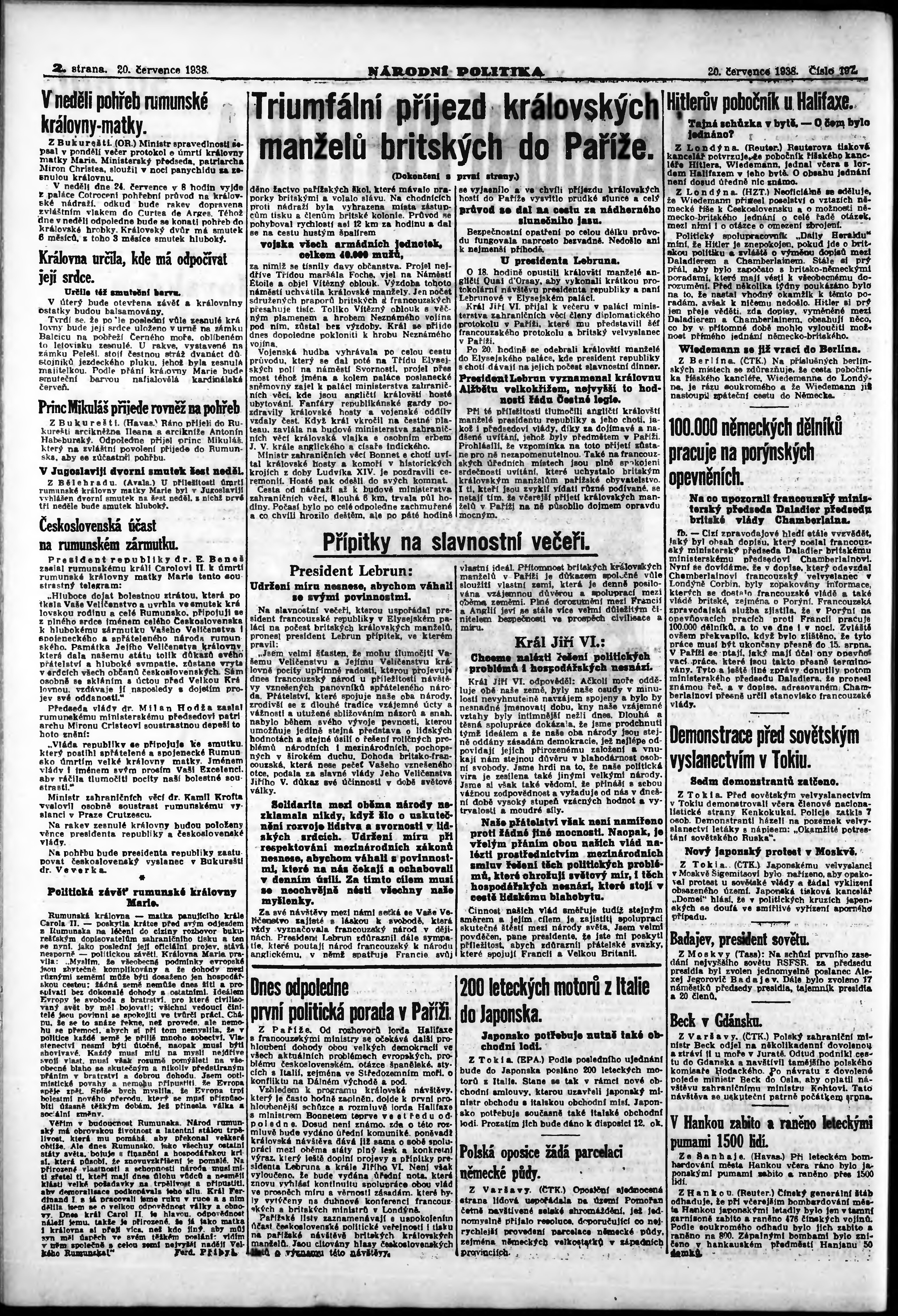 * Datum vydání výtisku: 20.7.1938 Číslo výtisku: 197 Poznámky k výtisku: ranní vydání; vydání pro Prahu;