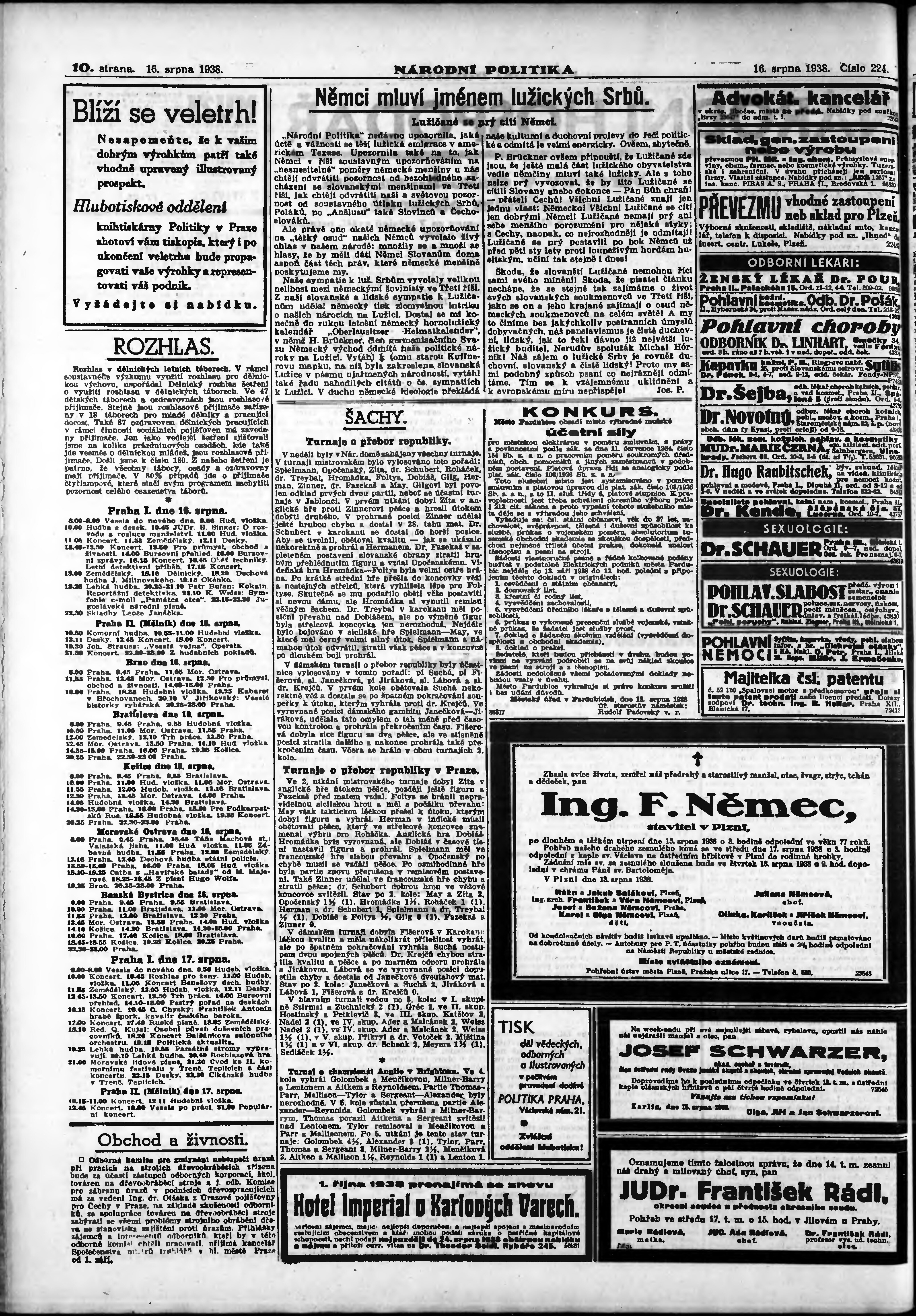 * Datum vydání výtisku: 16.8.1938 Číslo výtisku: 224 Poznámky k výtisku: ranní vydání; vydání pro Prahu;