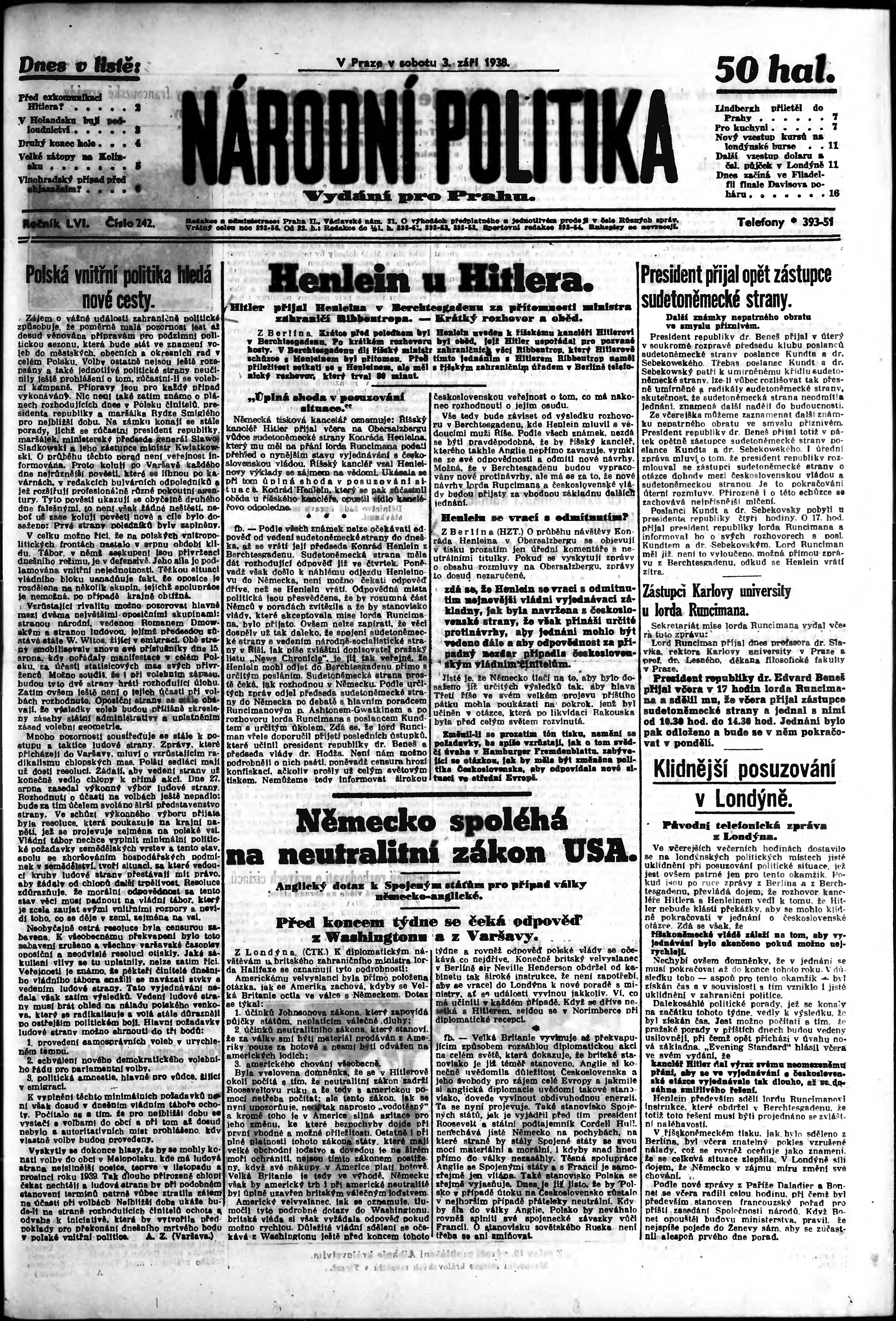 * Datum vydání výtisku: 3.9.1938 Číslo výtisku: 242 Poznámky k výtisku: ranní vydání; vydání pro Prahu;