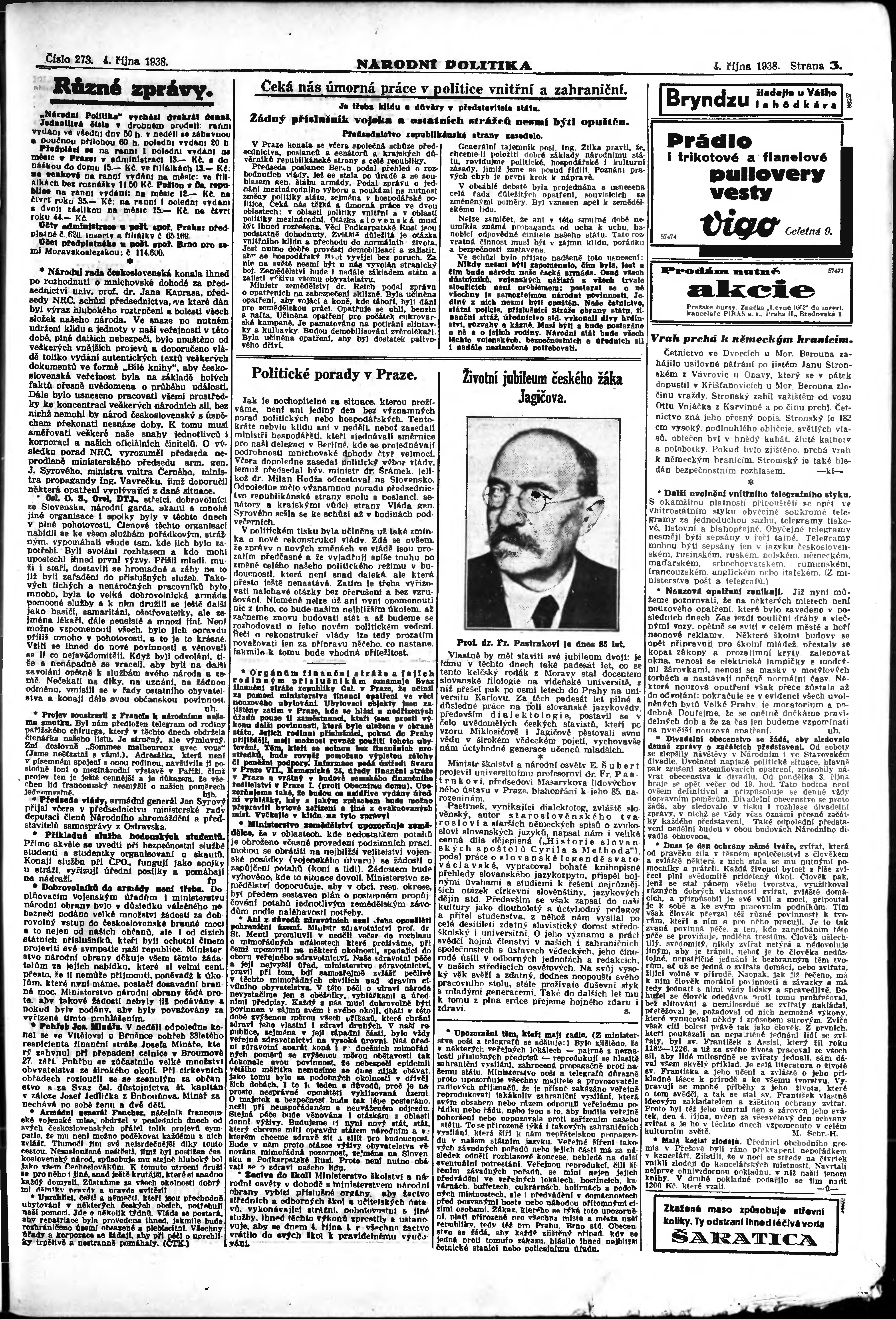 * Datum vydání výtisku: 4.10.1938 Číslo výtisku: 273 Poznámky k výtisku: ranní vydání; vydání pro Prahu;