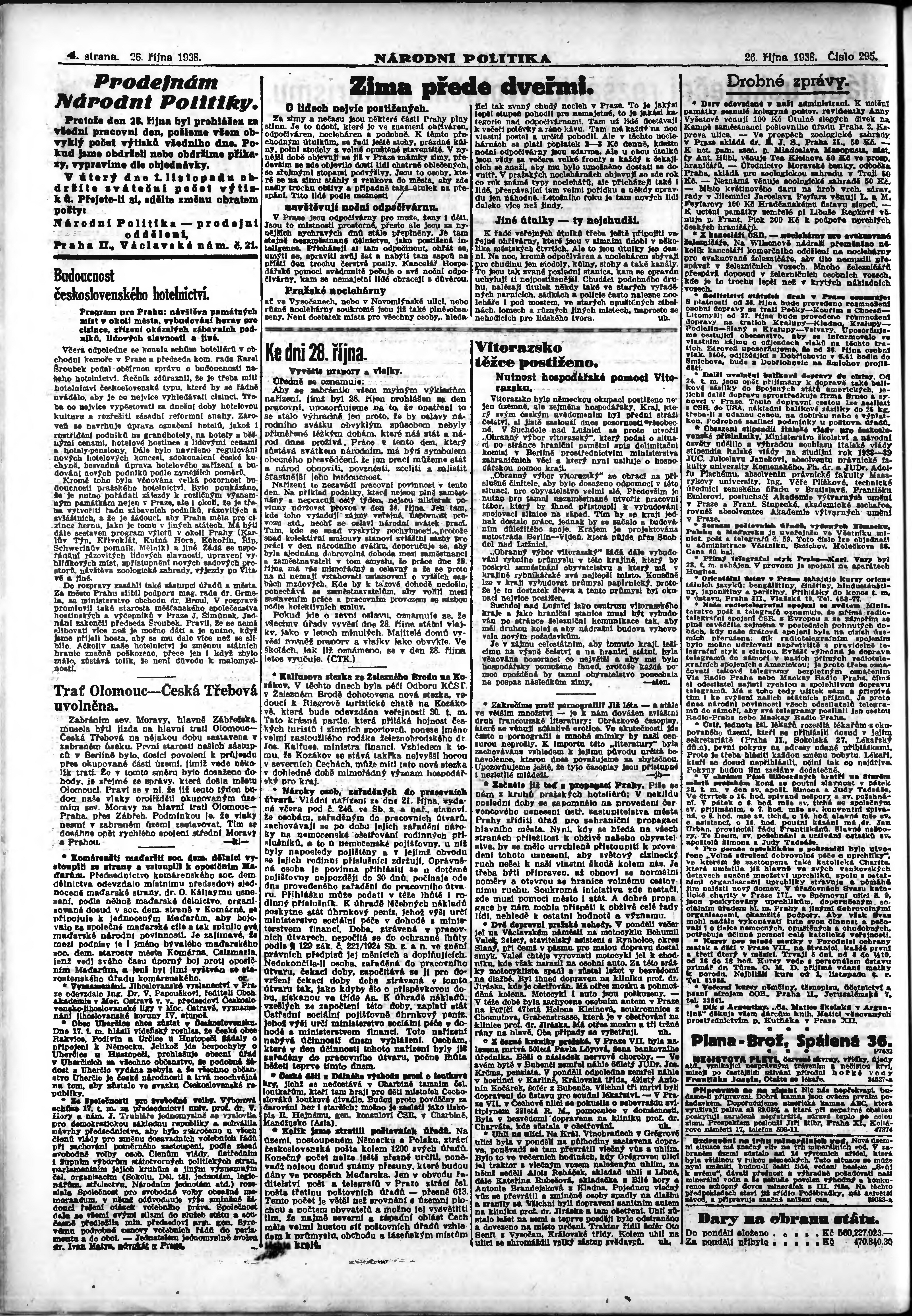 * Datum vydání výtisku: 26.10.1938 Číslo výtisku: 295 Poznámky k výtisku: ranní vydání; vydání pro Prahu;