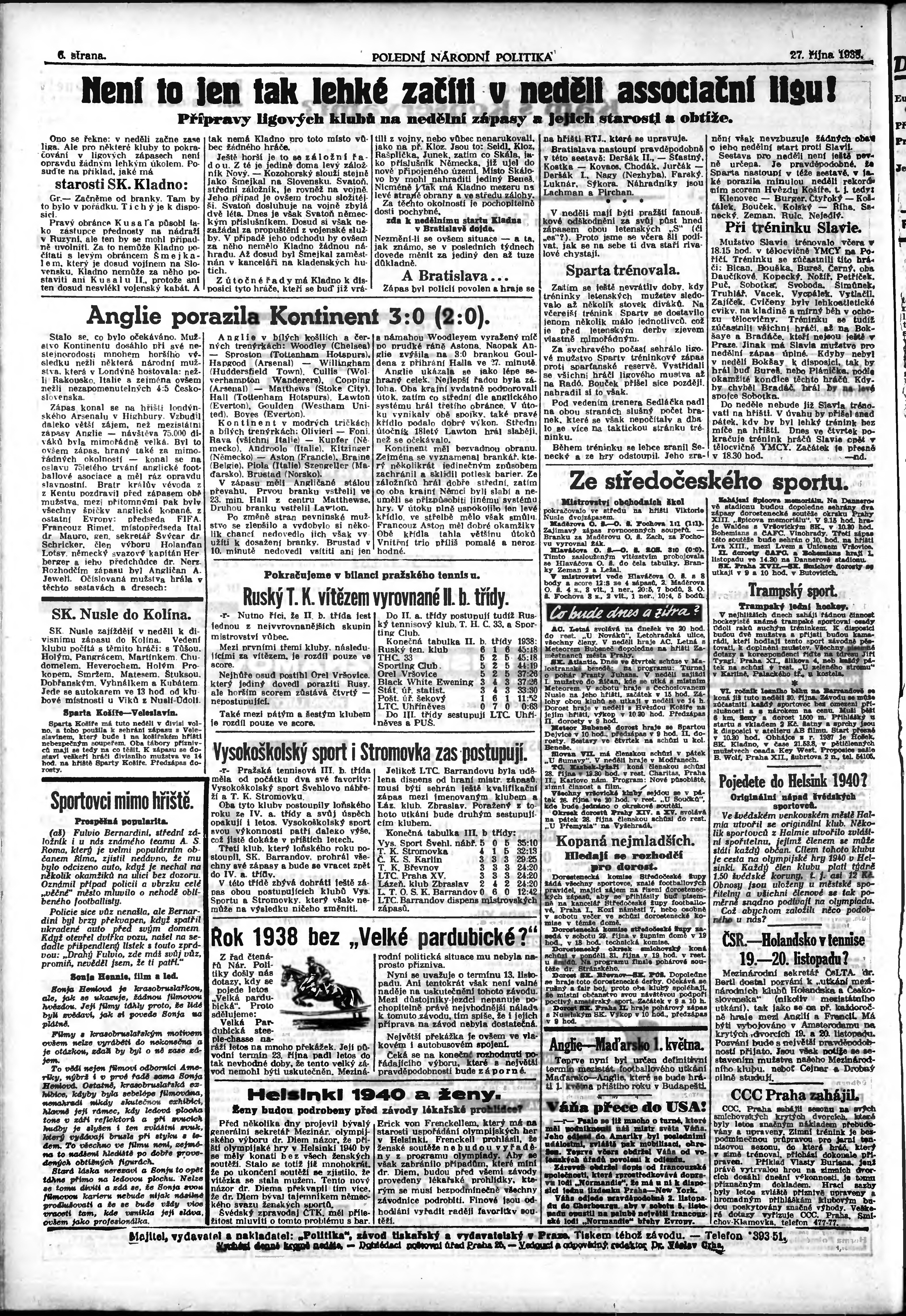 * Datum vydání výtisku: 27.10.1938 Číslo výtisku: 296 Poznámky k výtisku: polední vydání;