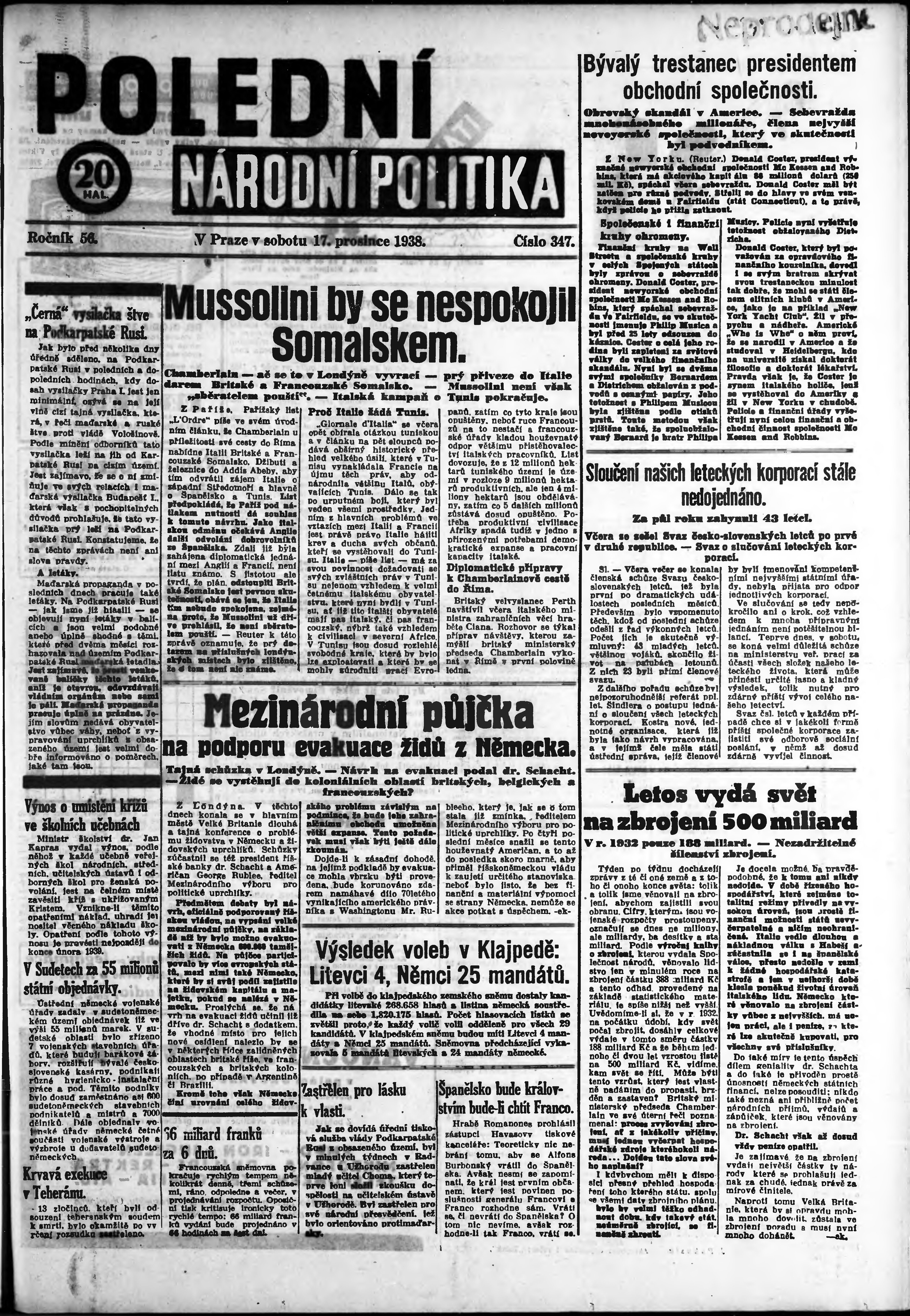 * Datum vydání výtisku: 17.12.1938 Číslo výtisku: 347 Poznámky k výtisku: polední vydání;