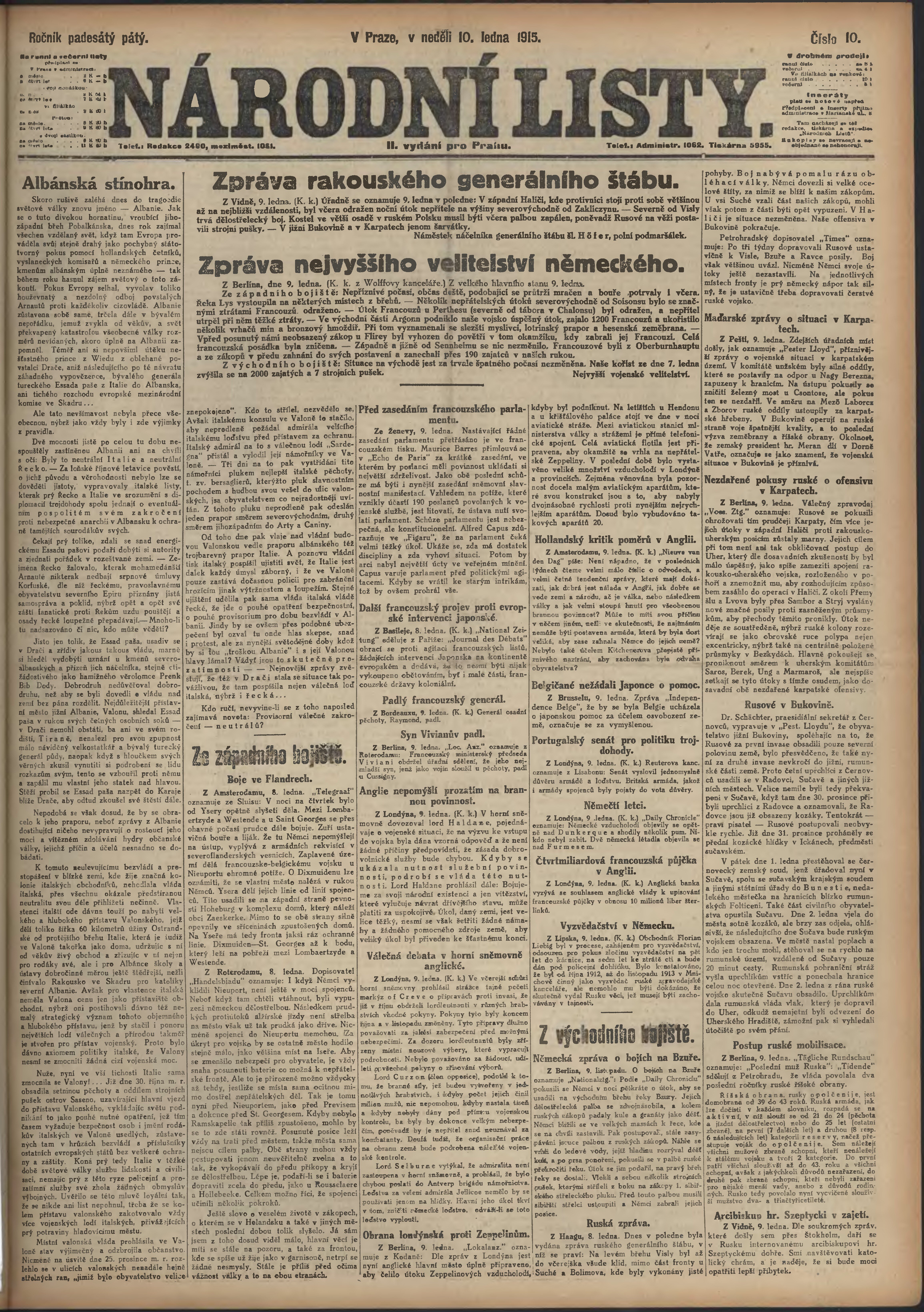 * Datum vydání výtisku: 10.1.1915 Číslo výtisku: 10 Poznámky k výtisku: ranní vydání; 2.vydání pro Prahu;