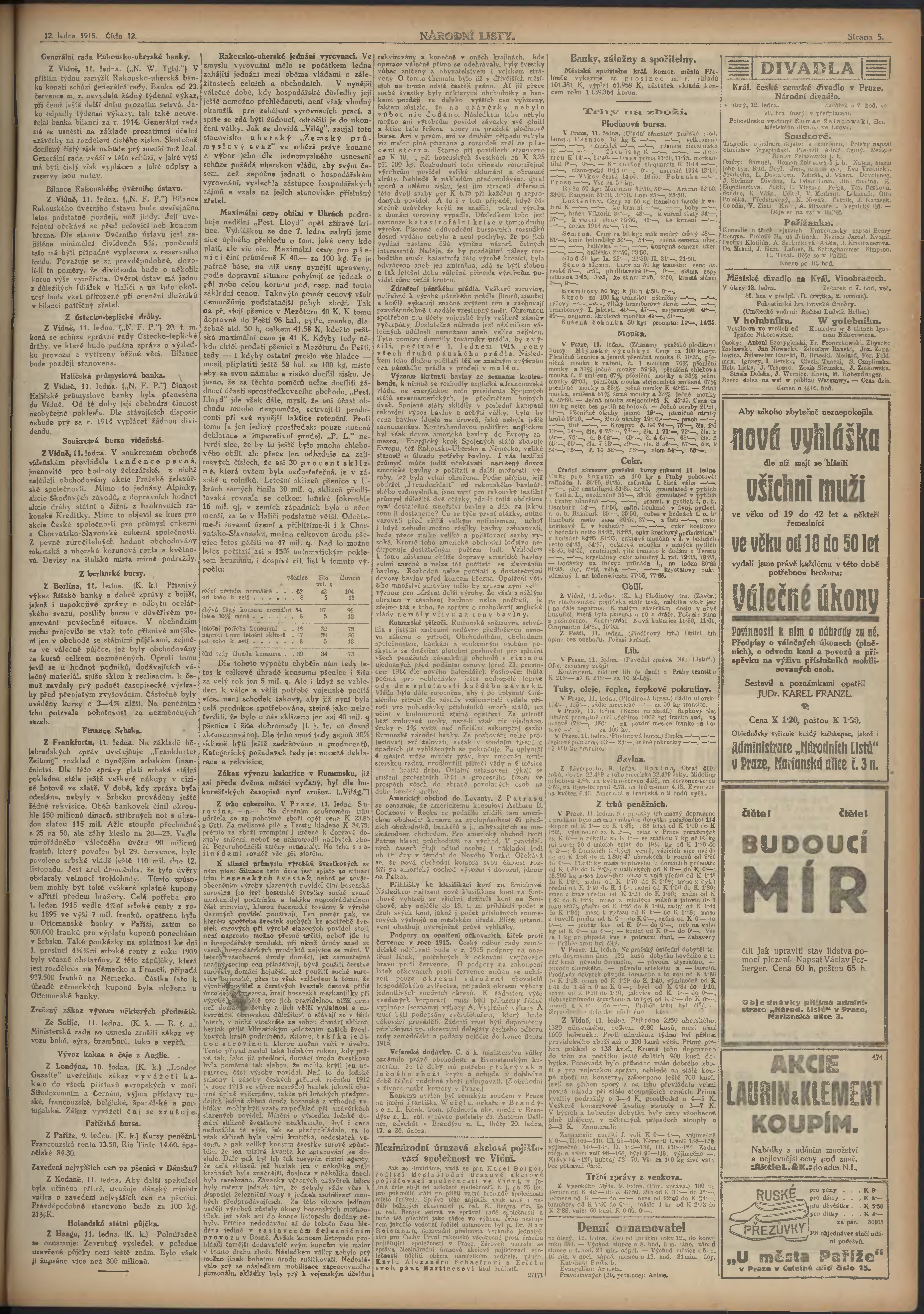 * Datum vydání výtisku: 12.1.1915 Číslo výtisku: 12 Poznámky k výtisku: ranní vydání; 2.vydání pro Prahu;