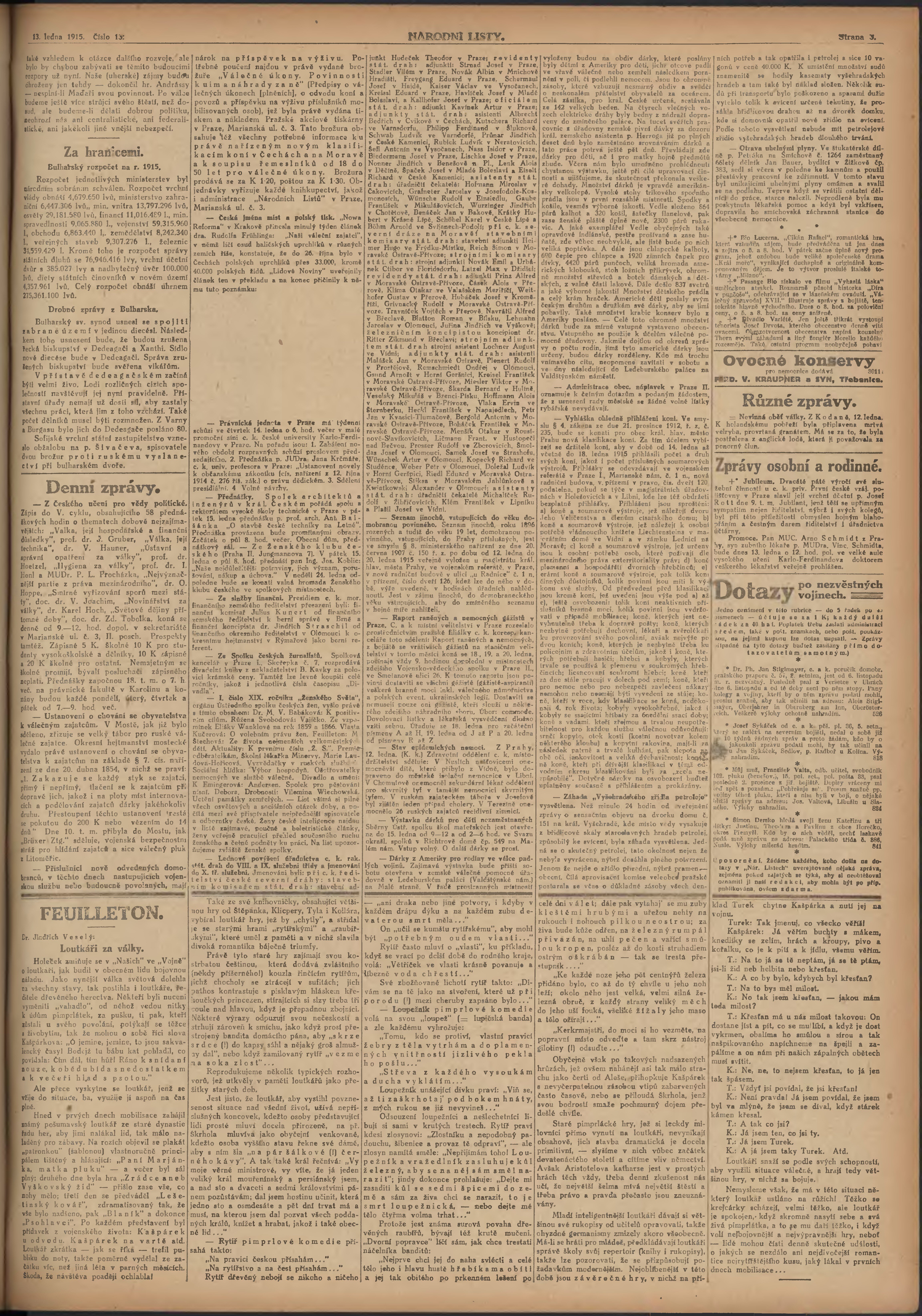 * Datum vydání výtisku: 13.1.1915 Číslo výtisku: 13 Poznámky k výtisku: ranní vydání; 2.vydání pro Prahu;