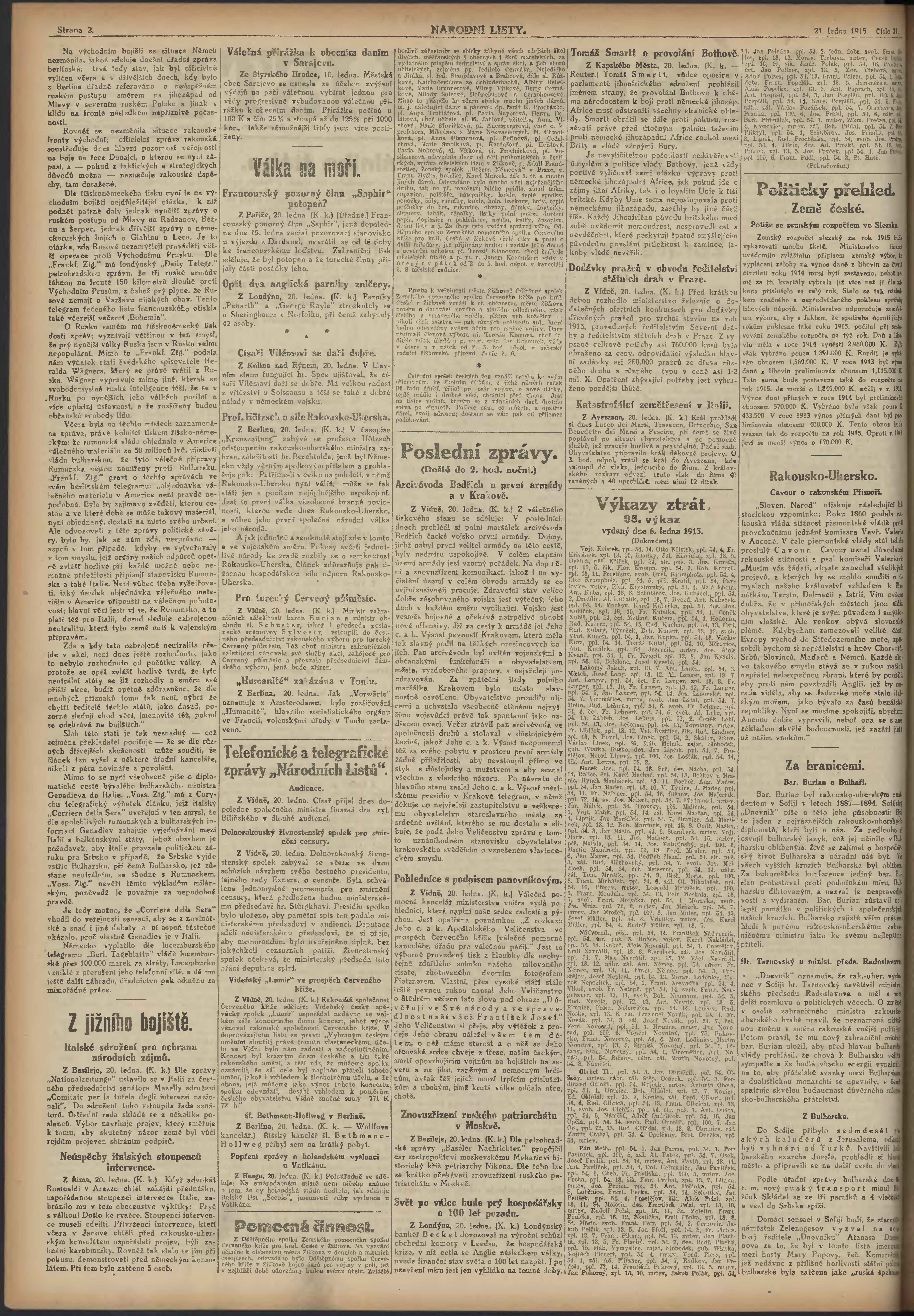 * Datum vydání výtisku: 21.1.1915 Číslo výtisku: 21 Poznámky k výtisku: ranní vydání; 2.vydání pro Prahu; nekonzistence číslování stran;