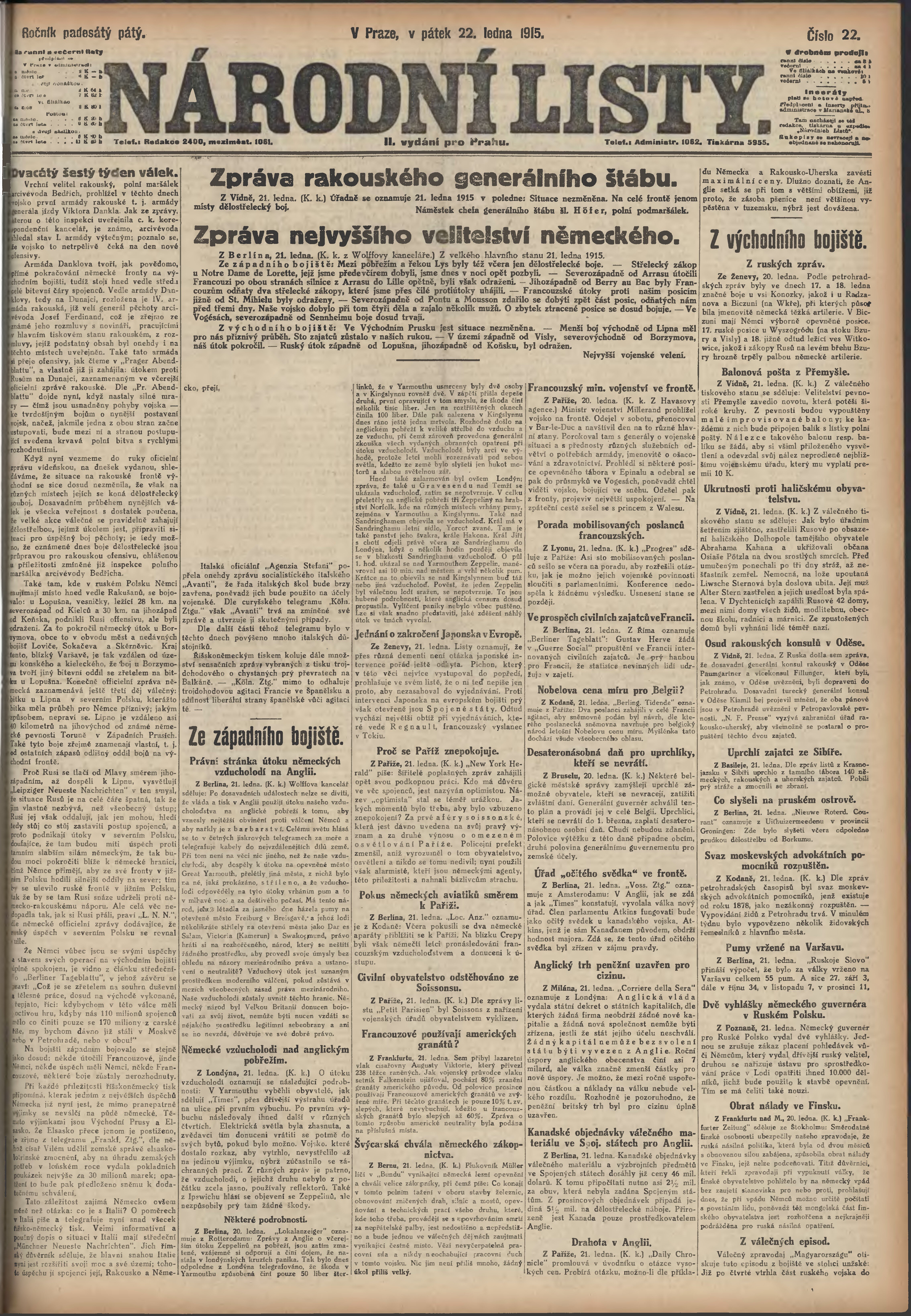 * Datum vydání výtisku: 22.1.1915 Číslo výtisku: 22 Poznámky k výtisku: ranní vydání; 2.vydání pro Prahu;
