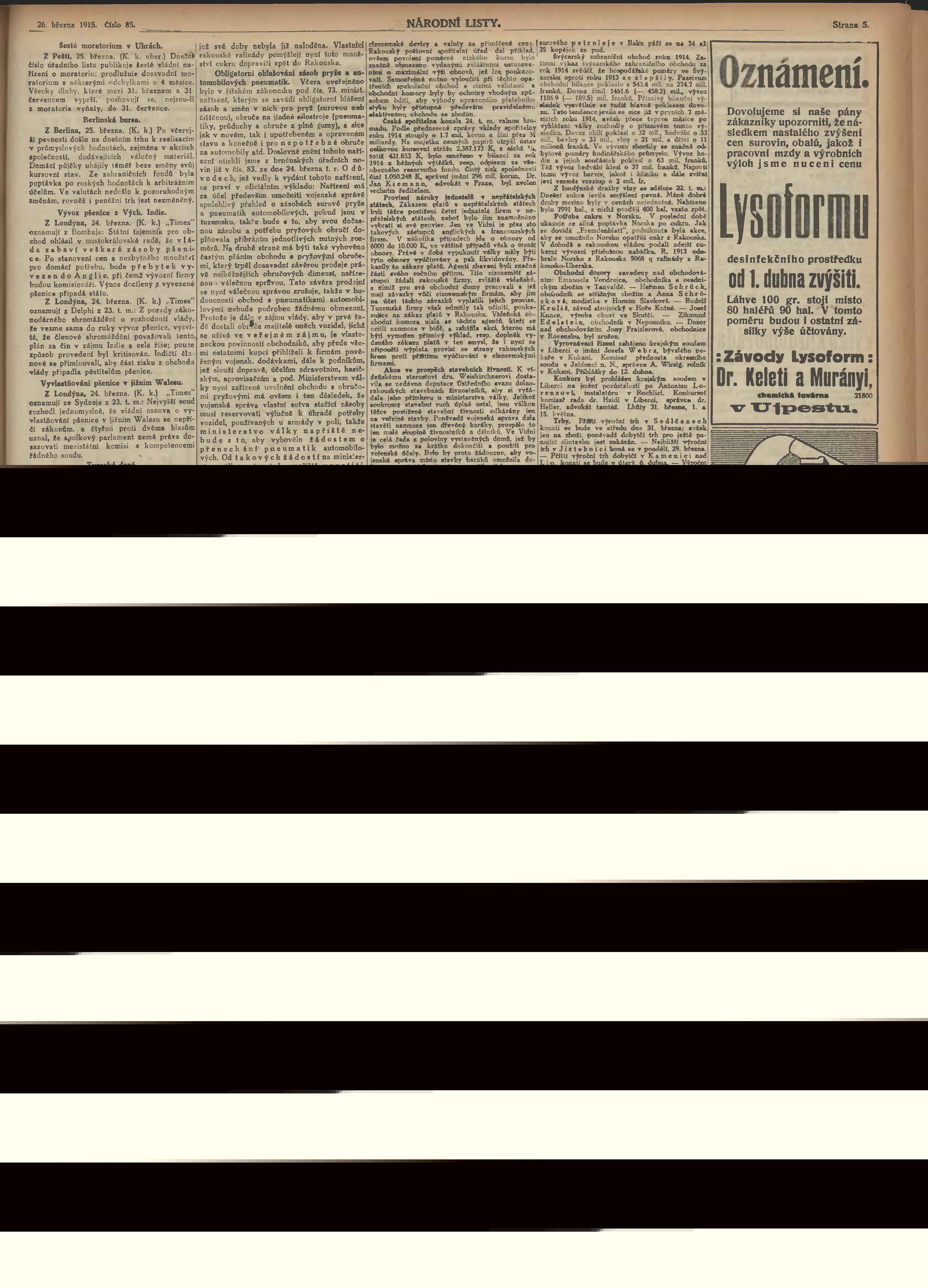 * Datum vydání výtisku: 26.3.1915 Číslo výtisku: 85 Poznámky k výtisku: ranní vydání; 2. vydání pro Prahu;