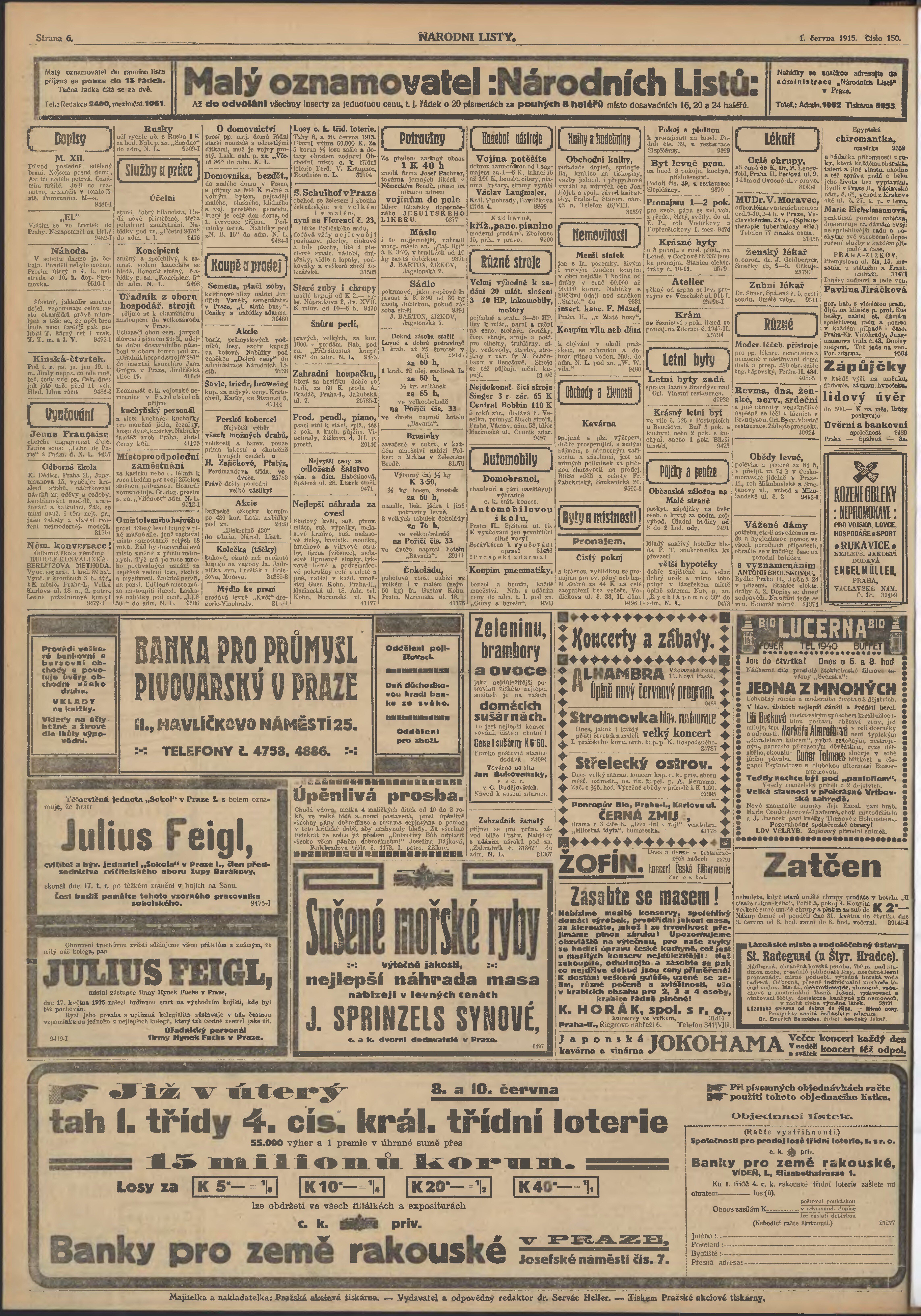 * Datum vydání výtisku: 1.6.1915 Číslo výtisku: 150 Poznámky k výtisku: ranní vydání; 2. vydání pro Prahu;