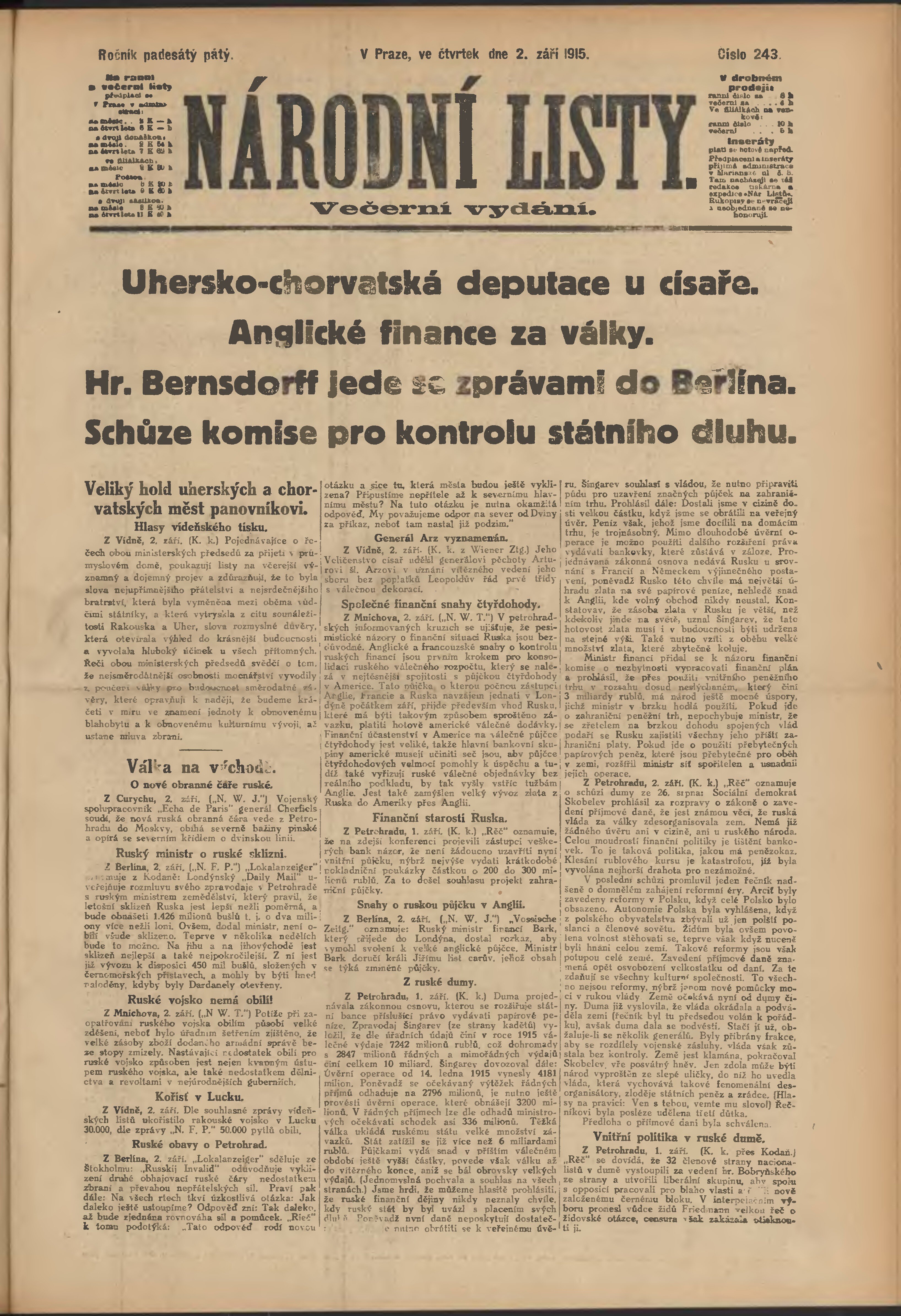 * Datum vydání výtisku: 2.9.1915 Číslo výtisku: 243 Poznámky k výtisku: večerní vydání;