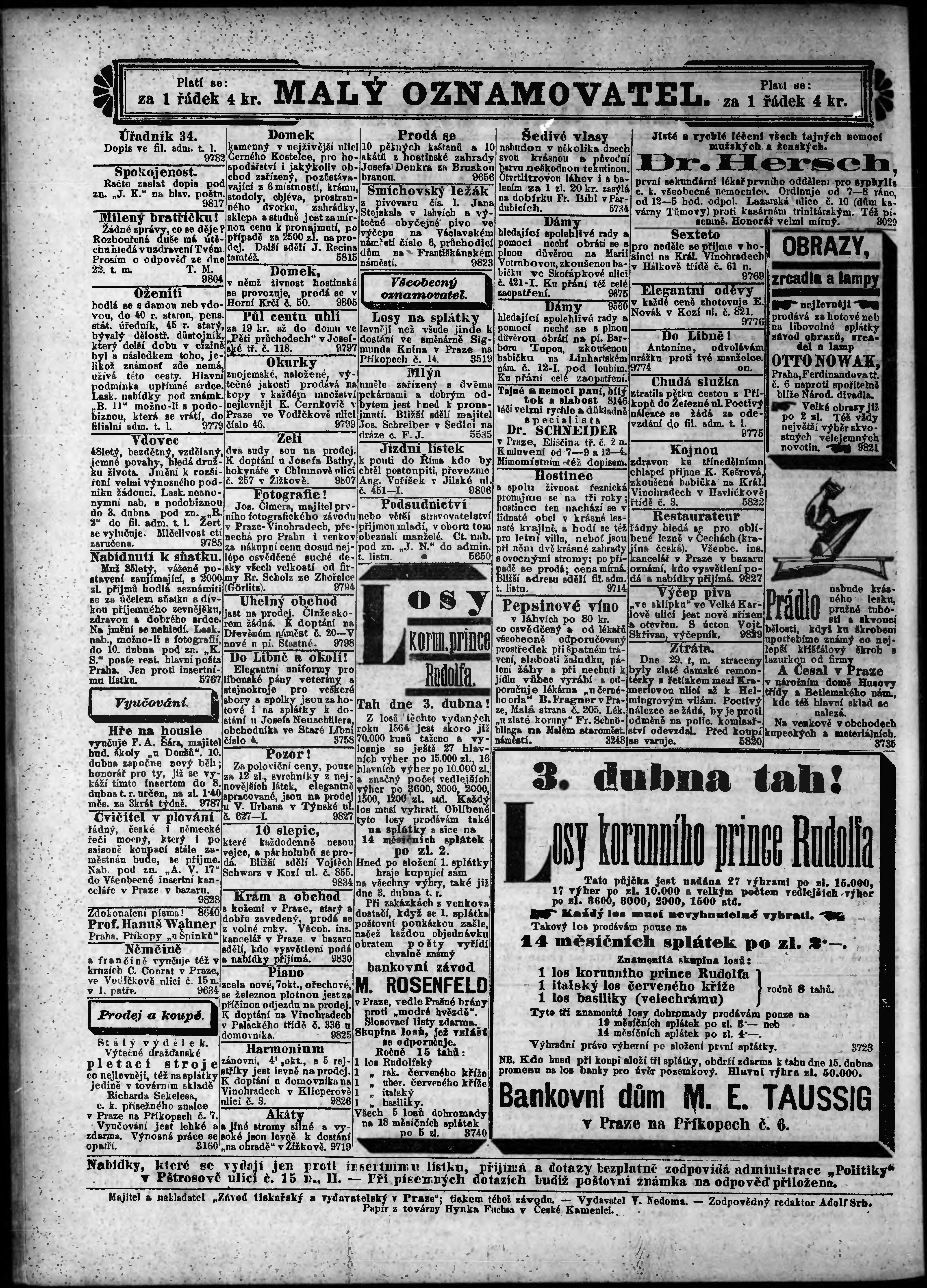 * Datum vydání výtisku: 31.3.1888 Číslo výtisku: 91