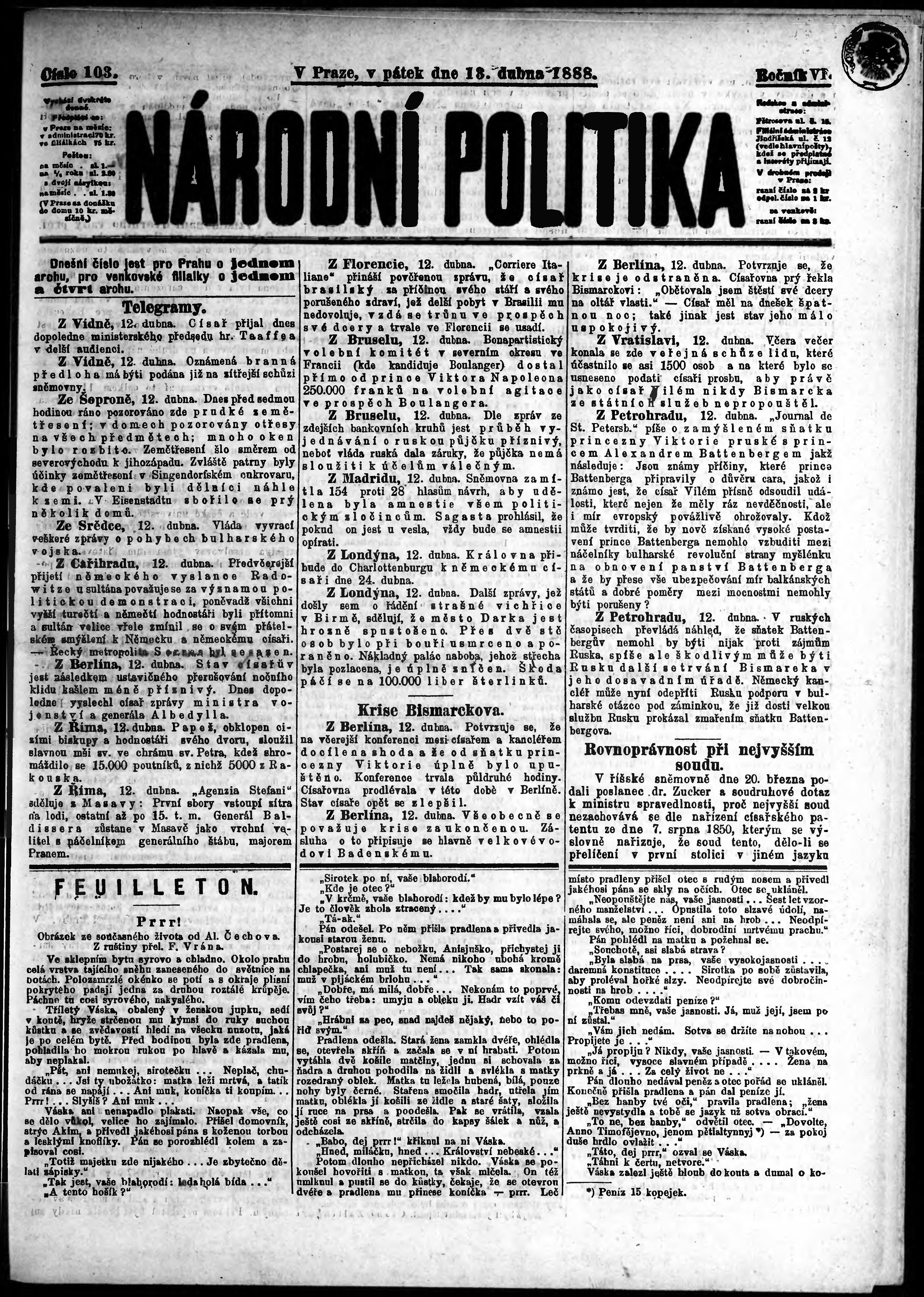 * Datum vydání výtisku: 13.4.1888 Číslo výtisku: 103
