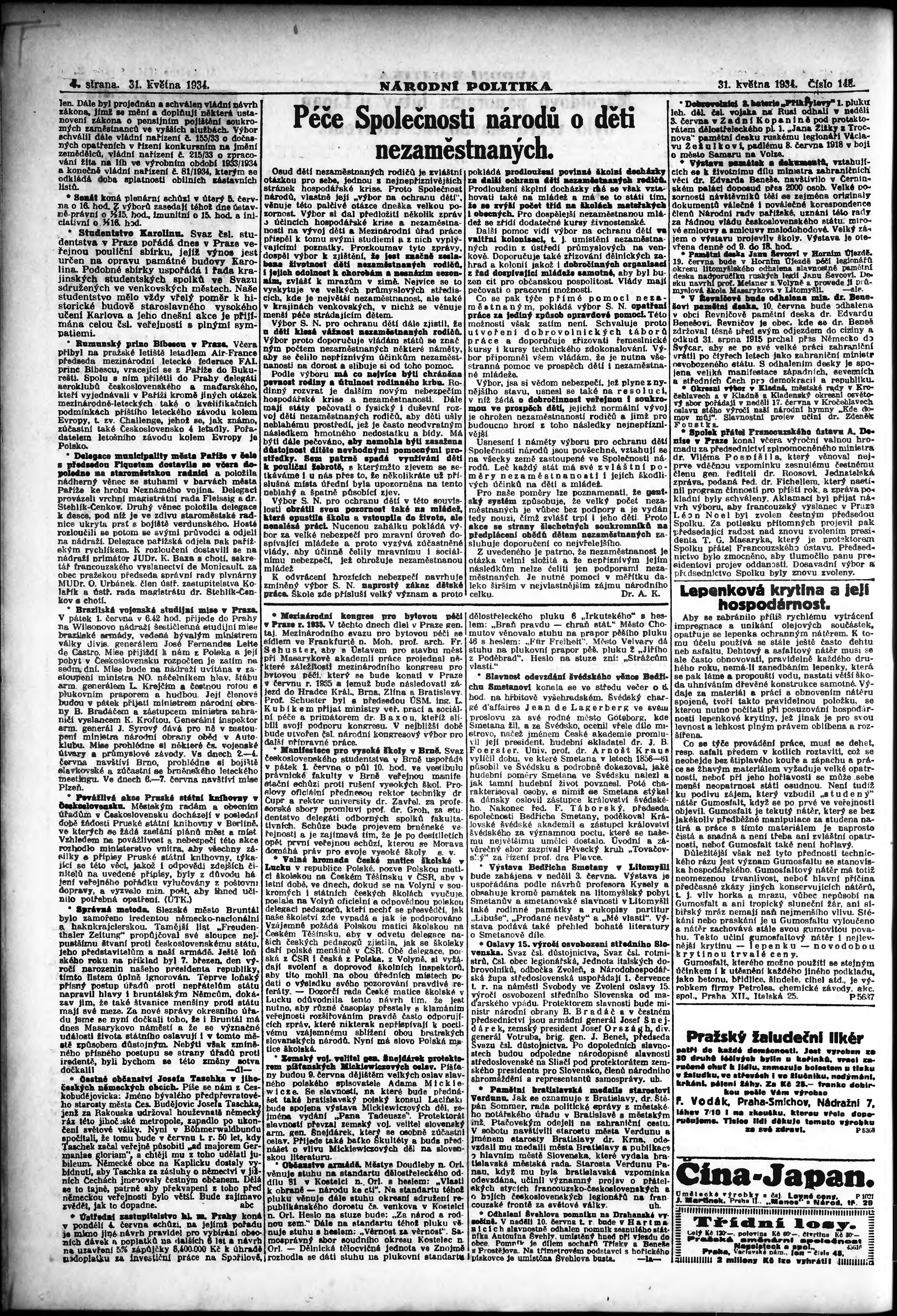 * Datum vydání výtisku: 31.5.1934 Číslo výtisku: 148 Poznámky k výtisku: ranní vydání;