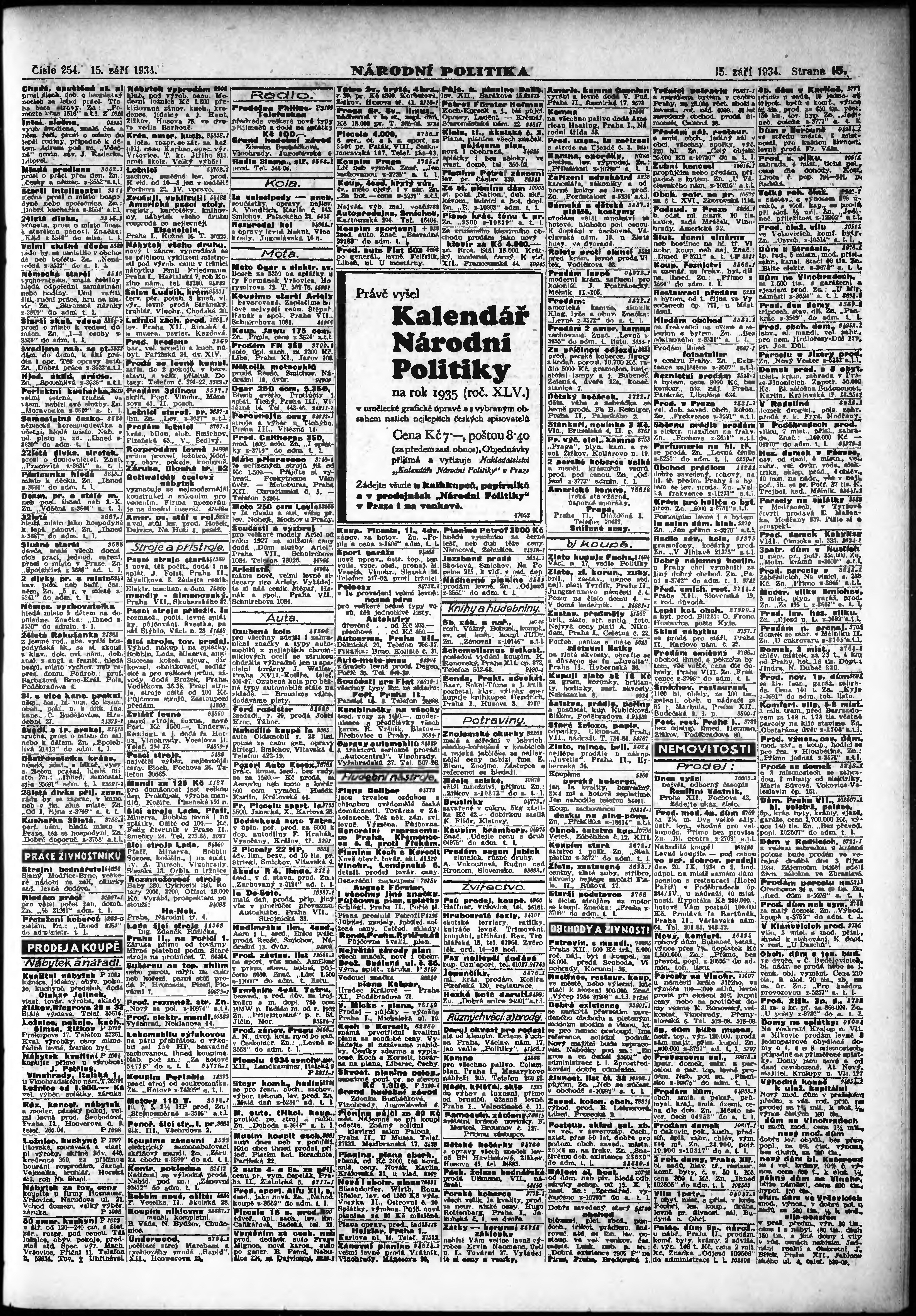 * Datum vydání výtisku: 15.9.1934 Číslo výtisku: 254 Poznámky k výtisku: ranní vydání; vydání pro Prahu;